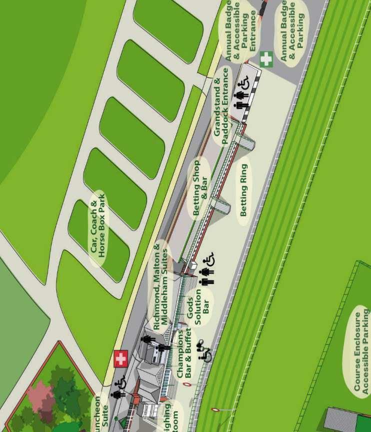 Facilities for Disabled Racegoers – Viewing ramps for wheelchair users only are situated next to the parade ring and in front of the grandstand. Disabled toilet facilities are available in the Gods Solution bar, next to the Luncheon Suite, next to the disabled car park and in the Course Enclosure facilities.