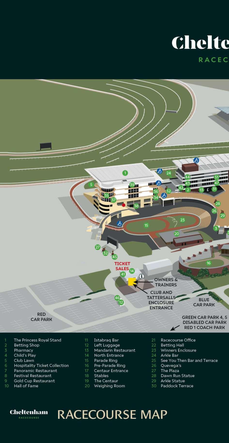 The Racecourse would be grateful if you would observe all Health & Safety requirements whilst you are at Cheltenham Racecourse. The emergency exits from the bars onto the grandstand steppings are painted yellow and we would request that you do not stop whilst in this area. We would also request that only those that are disabled use the disabled viewing ramp and that parents keep a close eye on all children and prevent them from climbing the running rails and getting on to the actual racecourse. We would also like to remind racegeors that the first aid room is located above the parade ring behind the See You Then Bar