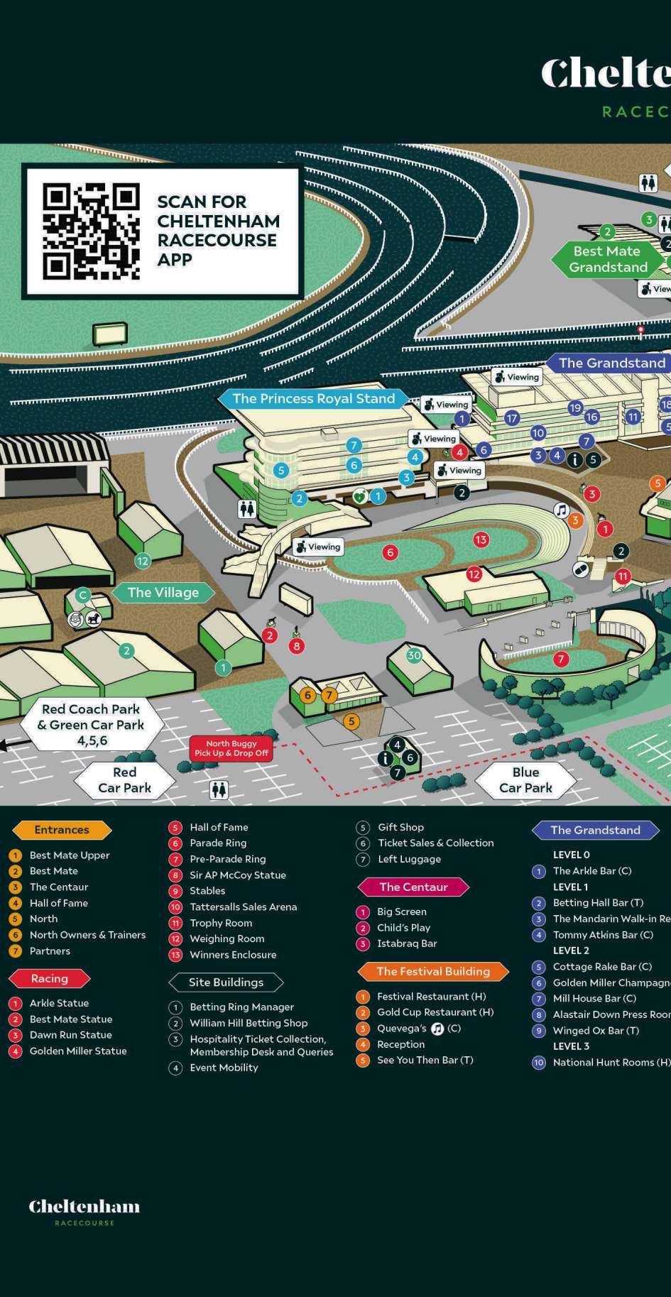 The Racecourse would be grateful if you would observe all Health & Safety requirements whilst you are at Cheltenham Racecourse. The emergency exits from the bars onto the grandstand steppings are painted yellow and we would request that you do not stop whilst in this area. We would also request that only those that are disabled use the disabled viewing ramp and that parents keep a close eye on all children and prevent them from climbing the running rails and getting on to the actual racecourse. We would also like to remind racegoers that the first aid room is located above the parade ring behind the See You Then Bar