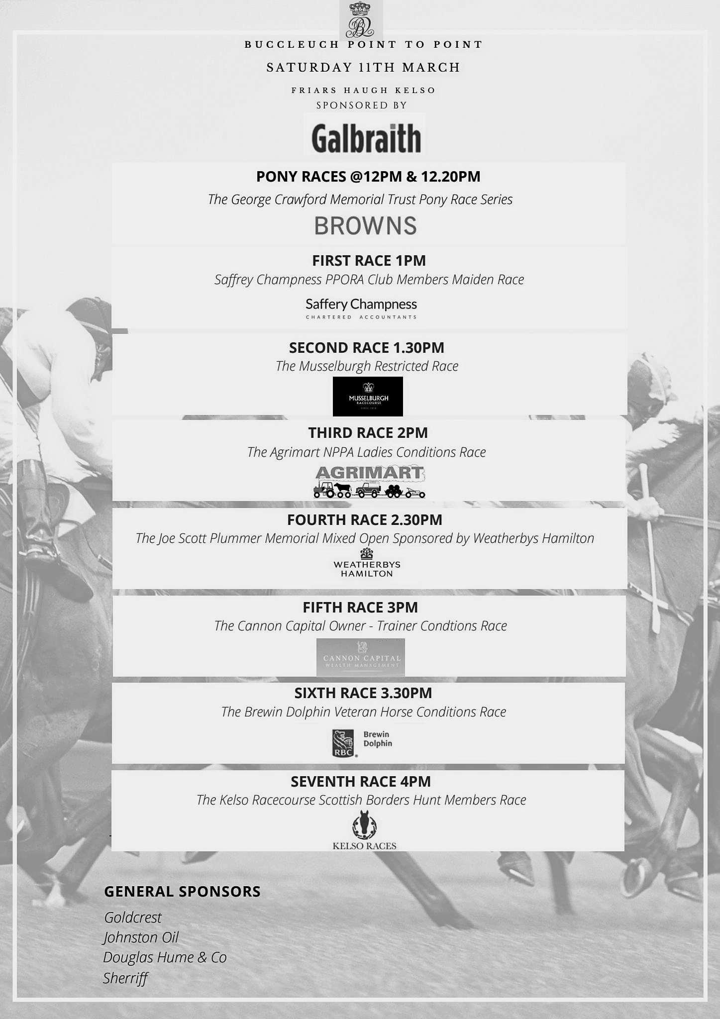 The Masters and the Committee of the Buccleuch Point To Point wish to express their sincere appreciation to the Sponsors of this meeting and thank them for their generosity.