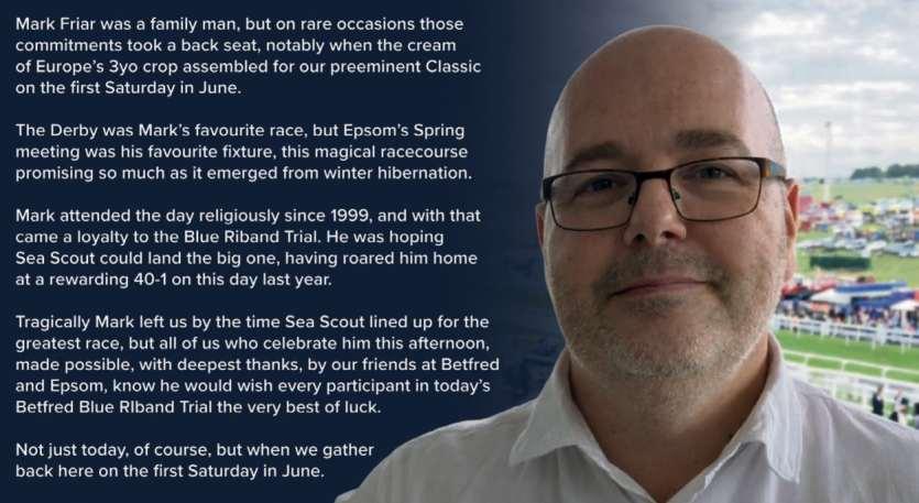 Second Race 2.40 - THE BETFRED BLUE RIBAND TRIAL STAKES (CLASS 1) (Listed Race) Distributed in accordance with the Stakes and Prize Money Code. £34026 to the winning horse The second to receive £12900, the third £6456, the fourth £3216, the fifth £1614 and the sixth £810 for three yrs old only Enter by noon, April 22nd and pay £300 stake, Declare by 10.00 a.m. April 26th. Weights: Colts and geldings 9st 3lb; fillies 8st 12lb Penalties, afterAugust 31st, 2025, a winner of a Group 3 Listed race 3lb Of a Group 1 Group 2 race 5lb BETFRED has generously sponsored this race All number cloths to be carried in this race have been sponsored and will carry the name/logo of BETFRED The sponsorship payment of £250 will be distributed equally amongst all horses starting in this race in accordance with paragraphs 24 to 27 of the Stakes and Prize Money Code. All number cloths to be carried in this race have been sponsored and will carry the name/logo of BETFRED The sponsorship payment of £250 will be distributed equally amongst all horses starting in this race in accordance with paragraphs 24 to 27 of the Stakes and Prize Money Code. The winning horse in this race, if not a gelding or already entered, will receive an automatic entry to this year’s Betfred Derby at Epsom Downs. This is on the proviso that, should the horse remain in the Betfred Derby after the May Scratching stages and the Confirmation stage, the owner will be liable to meet the corresponding payments of £5750, £5750 and £4500 respectively Please also note that this does not guarantee a place in the final field for the Betfred Derby and the horse will be subject to the usual elimination procedure under the Elimination and Balloting Procedures (contained in the Race Administration Code) ofthe Rules of Racing. In the event of a dead-heat, both horses, if qualified as above, will receive an automatic entry to the Betfred Derby. 17 entries at £300. - Closed April 22nd, 2026. Owners Prize Money. Winner £26736; Second £10974; Third £5490; Fourth £2742; Fifth £1374; Sixth £684. (PenaltyValue £34026) A SS