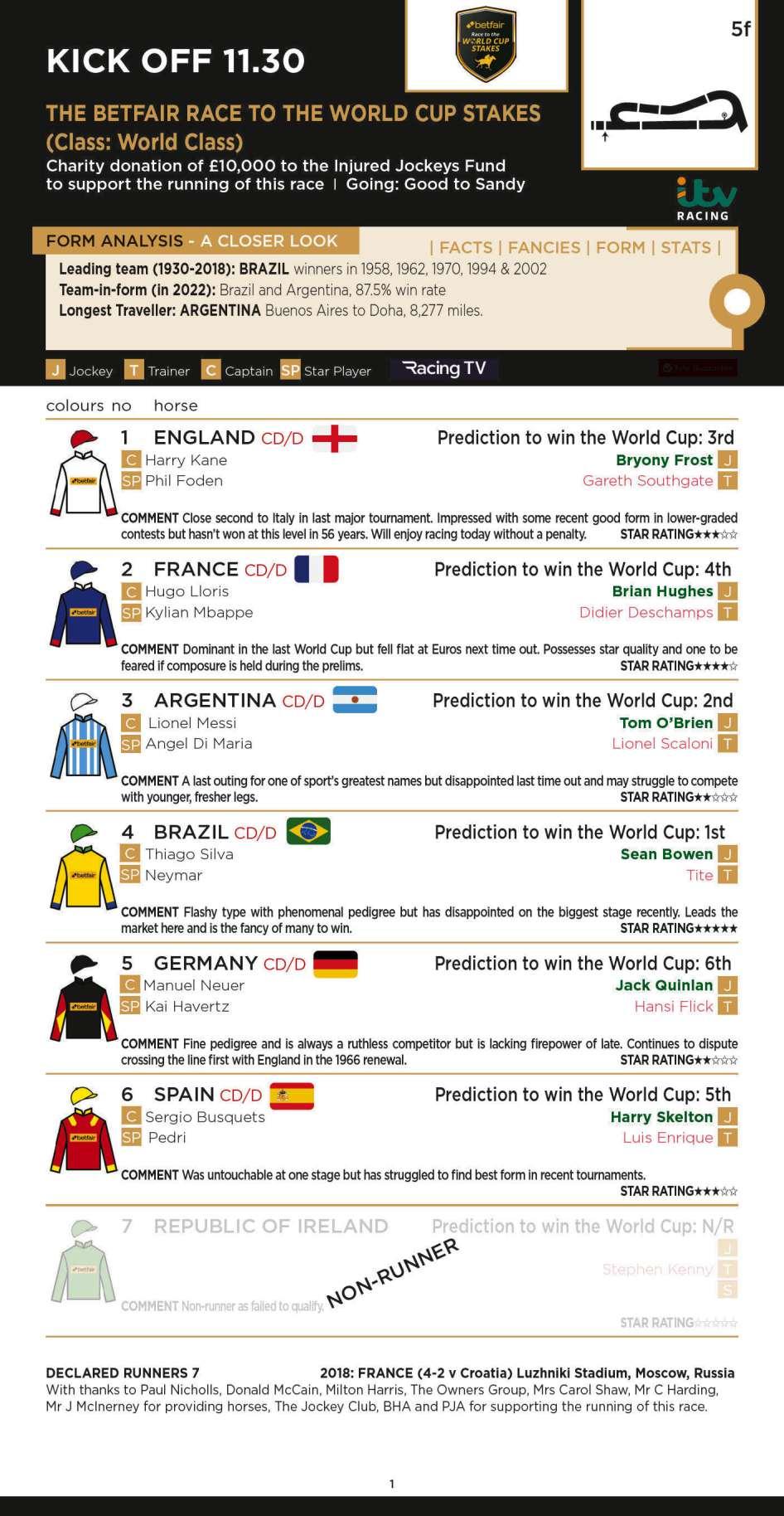While racing officially gets underway at 12.10pm, Betfair have organised a special event at 11.30am, which will see six horses take to the track in five-furlong sprint in celebration of the forthcoming Football World Cup. It’s bound to be a lot of fun and I encourage you all to make your way trackside for this novelty race Very kindly, Betfair will also be donating £10,000 to the Injured Jockey’s Fund