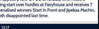 TIMEFORMVIEWIntheprocessofrunningpoorlywhenfallinginthisracelastseasonbuthasbeenintopformthisterm,producingacareerbest towinGrade3handicapatFairyhouseunderthisrider60daysago.Likelytomakeabetterfistofitthistimearound. TFRHHHHI BHA138