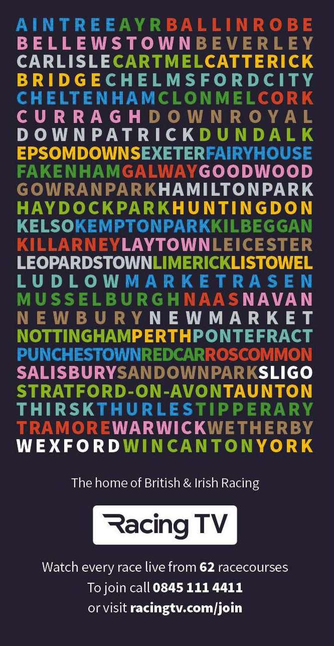 Third Race 5.15 THE RACING TV HANDICAP STAKES (CLASS 6) (DIV I) Distributed in accordance with the Stakes and Prize Money Code £2916 to the winning horse The second to receive £1368, the third £684, the fourth £342, the fifth £300 and the sixth £300 for three yrs old and upwards, Rated 46-60 (also open to such horses rated 61 and 62; such horses rated 45 and below are also eligible see Standard Conditions). £27 stake if the horse is rated 46 or higher, or £5 stake if the horse is rated 45 or lower with £22 extra if the horse is declared to run Declare by 10.00 a.m. November 28th. Lowest weight: 4-y-o and up 8st 9lb; 3-y-o 8st 7lb Highest weight: 4-y-o and up 9st 9lb; 3-y-o 9st 7lb Penalties, after November 19th, 2022, for each race won 3yo 6lb; 4yo to 6yo 5lb; 7yo and up 4lb Racing TV has generously sponsored this race and will present a memento to the winning owner 19 entries, 2 at £5 and 17 at £27. Closed November 24th, 2022. Owners Prize Money. Winner £2304; Second £1152; Third £576; Fourth £288; Fifth £240; Sixth £240 (Penalty Value £2916) SS SEE PAGE 10 FOR THIS RACE.