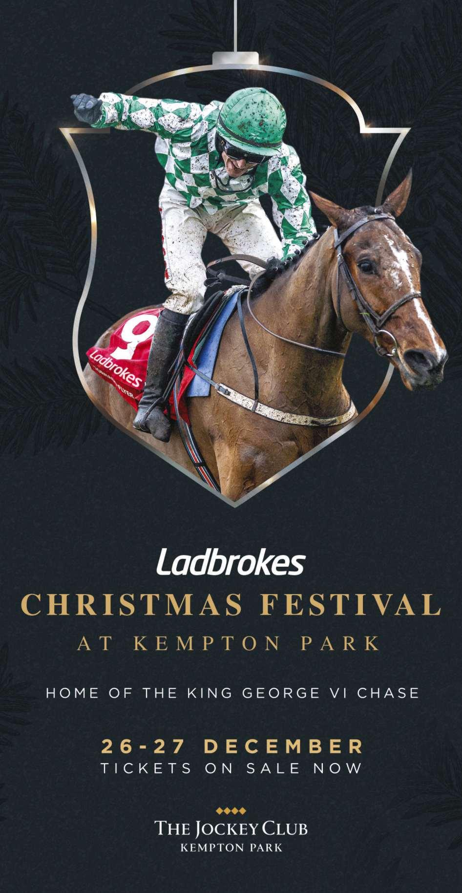1.ARAMIS GREY (IRE) 2.TOTAL COMMITMENT (IRE) 3.TYGER BAY RACE RESULT 1ST 2ND 3RD 4TH RACE TIME DISTANCE CUSTOMER PROMISE The team at Kempton recognise how important you are to our business. Our Customer Promise is that we are committed to delivering the best experience we can for you by: • Being welcoming and friendly • Treating you with respect • Being flexible to your needs • Being committed to consistently delivering quality & value • Providing clear and relevant information in a timely and appropriate manner • Encouraging and valuing your feedback to help us improve your experience All we ask is that if you feel like we haven’t delivered on this promise or would like to offer us any feedback on your experience, please do let us know by emailing us at kempton.information@thejockeyclub.co.uk T: 0344 579 3008 E: kempton.information@thejockeyclub.co.uk W: thejockeyclub.co.uk/kempton You must be 18 or over to place a bet You may be asked to provide proof of your age when placing a bet If you cannot produce this your bet will not be accepted TODAY’S RACE SPONSOR find out more about today’s race sponsor at unibet.co.uk