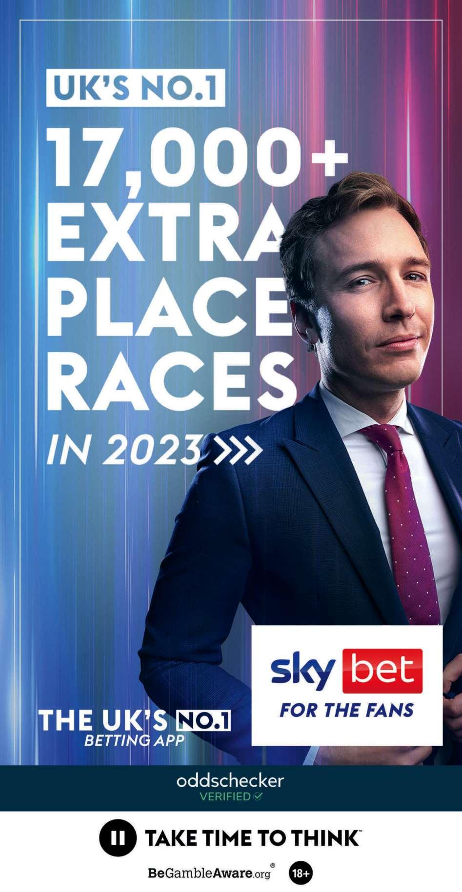 Fifth Race 5.45 - THE SKY BET EXTRA PLACES EVERY DAY HANDICAP STAKES (CLASS 2) Distributed in accordance with the Stakes and Prize Money Code. £38655 to the winning horse The second to receive £18127, the third £9067, the fourth £4530, the fifth £2265 and the sixth £1132. for three yrs old only, Rated 0-105 (also open to such horses rated 106 and 107; such horses rated 78 and below are also eligible - see Standard Conditions) £375 stake if the horse is rated 79 or higher, or £75 stake if the horse is rated 78 or lower with £300 extra if the horse is declared to run Declare by 10.00 a.m. May 17th. Lowest weight 8st 2lb; Highest weight not less than 9st 9lb Penalties, after May 11th, 2024, for each race won 6lb SKYBET has generously sponsored this race and will kindly present a memento to the winning owner, trainer and jockey In addition, they will award a cash prize to the stable employees responsible for the horses judged to be the first, second and third best turned out in this race PLEASE NOTE: In accordance with the provisions of paragraph 9 of the Weights and Handicapping Code a horse must have run three times or more in order to qualify to run in this race 17 entries at £375 - Closed May 13th, 2024 Owners Prize Money. Winner £30473; Second £15240; Third £7620; Fourth £3810; Fifth £1905; Sixth £953. (Penalty Value £38655) Weights raised 4lb and paragraphs 27 to 31 ofthe Weights and Handicapping Code complied with where applicable. SS SEE PAGE 34 FOR THIS RACE.