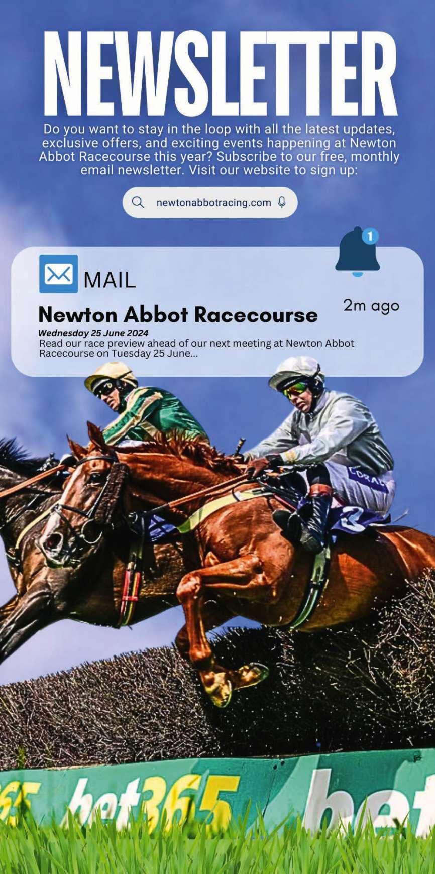 Second Race 2.35 - THE NEWTON ABBOT RACECOURSE CONFERENCE CENTRE HANDICAP HURDLE RACE (CLASS 5) (DIV I) Distributed in accordance with the Stakes and Prize Money Code. £5624 to the winning horse The second to receive £2587, the third £1293, the fourth £647 and the fifth £322. for four yrs old and upwards, Rated 0-100. Enter by noon, July 15th and pay £35 stake, Declare by 10.00 a.m. July 19th. Penalties, after July 13th, 2024, for each hurdle race won 7lb. Newton Abbot are kindly supporting the prize money of this race and will present a memento to the winning owner In addition, a £60 cash prize will be awarded to the lad or lass responsible for the best turned out horse in the race. 20 entries at £35. - Closed July 15th, 2024. Owners Prize Money. Winner £4302; Second £2150; Third £1076; Fourth £538; Fifth £268. (Penalty Value £5624.26) Weights raised 3lb and paragraph 34 of the Weights and Handicapping Code complied with where applicable.