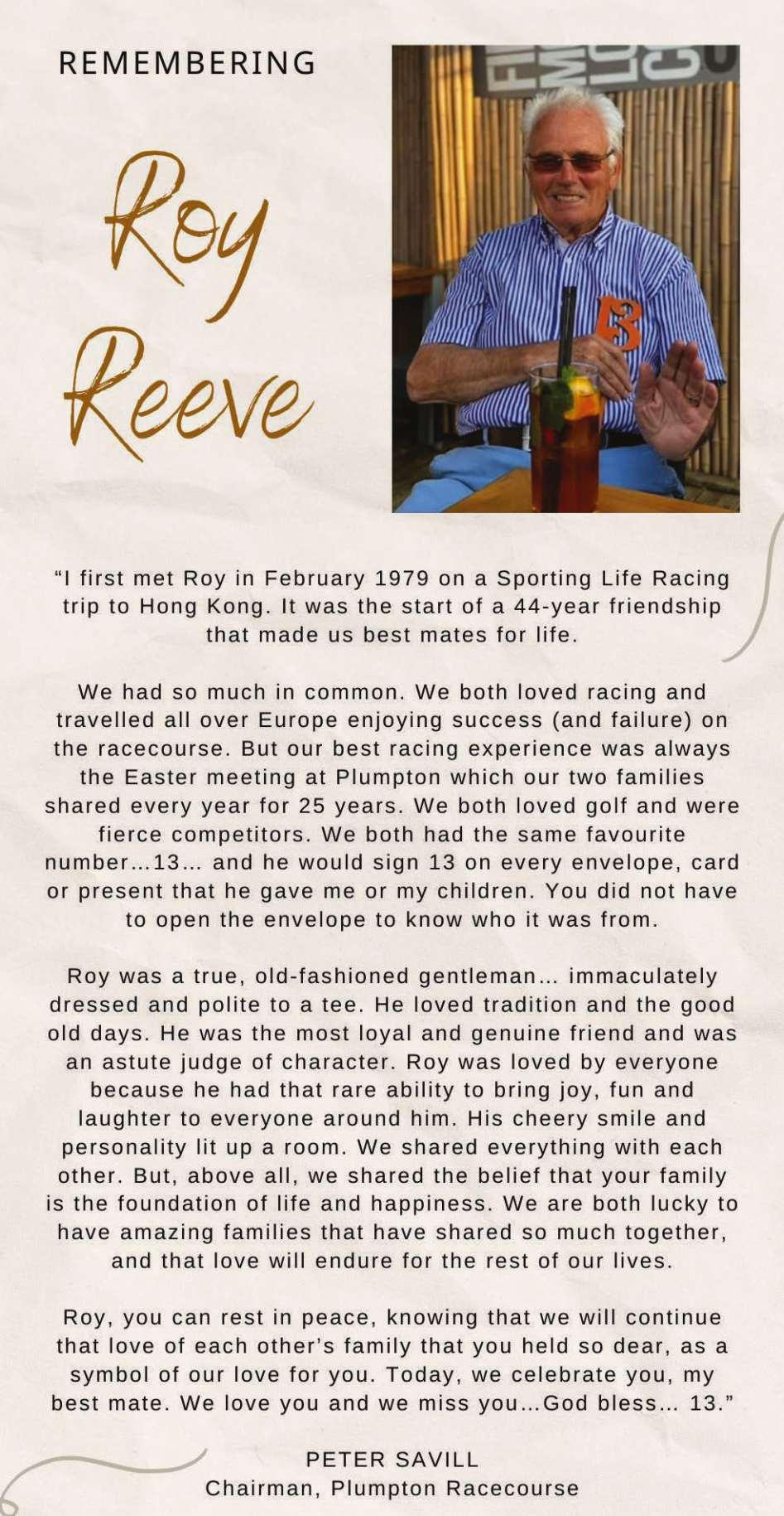 Third Race 3.10 - THE ROY REEVE MEMORIAL MAIDEN HURDLE RACE (CLASS 4) (GBB RACE) Distributed in accordance with the Stakes and Prize Money Code. £5446 to the winning horse The second to receive £2509, the third £1254 and the fourth £628. for maiden four yrs old and upwards. Enter by noon, March 31st and pay £50 stake, Declare by 10.00 a.m. April 4th. Weights: 4-y-o 10st 10lb; 5-y-o and up 11st 4lb Fillies and mares allowed 7lb. Peter Savill has generously sponsored this race and will present a memento to the winning owner and a £50 cash prize to the stable employee in charge of the horse judged to be the best turned out. 14 entries at £50. - Closed March 31st, 2026. Owners Prize Money. Winner £4173; Second £2087; Third £1043; Fourth £522. (Penalty Value £5446)
