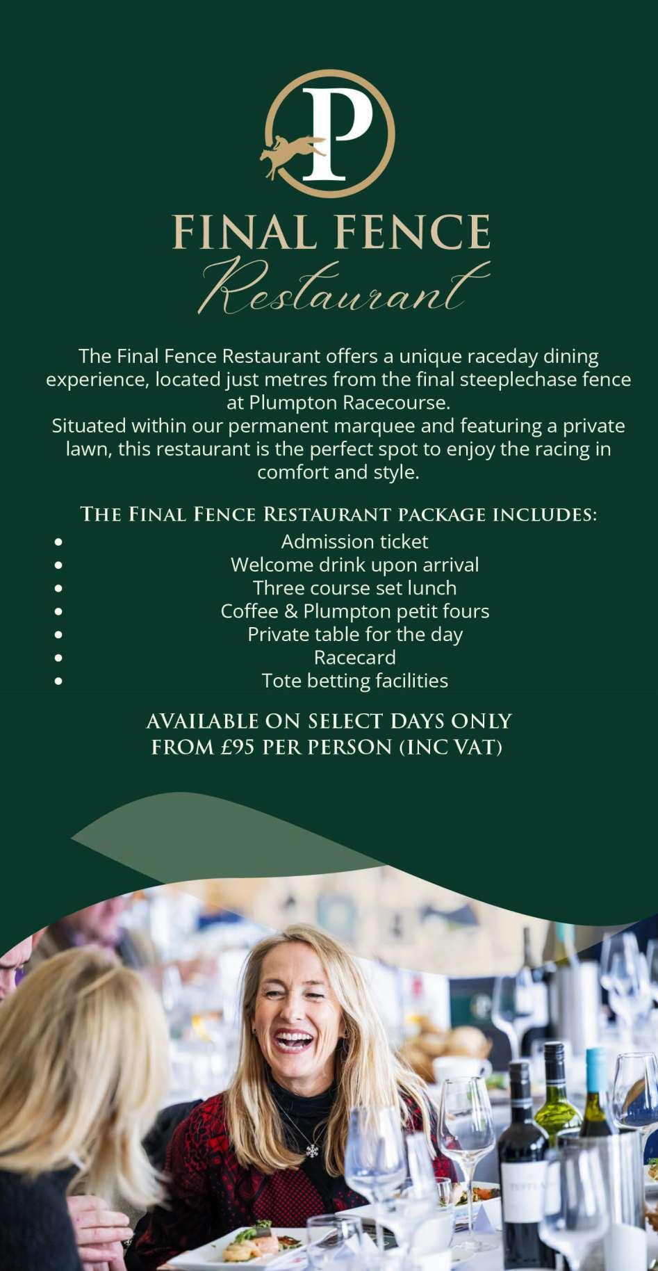 Situated on the home straight, opposite the final fence, with a private lawn. Starting at £95pp, the Final Fence Restaurant package includes a threecourse set menu, welcome drink, coffee & Plumpton petit fours, table for the
