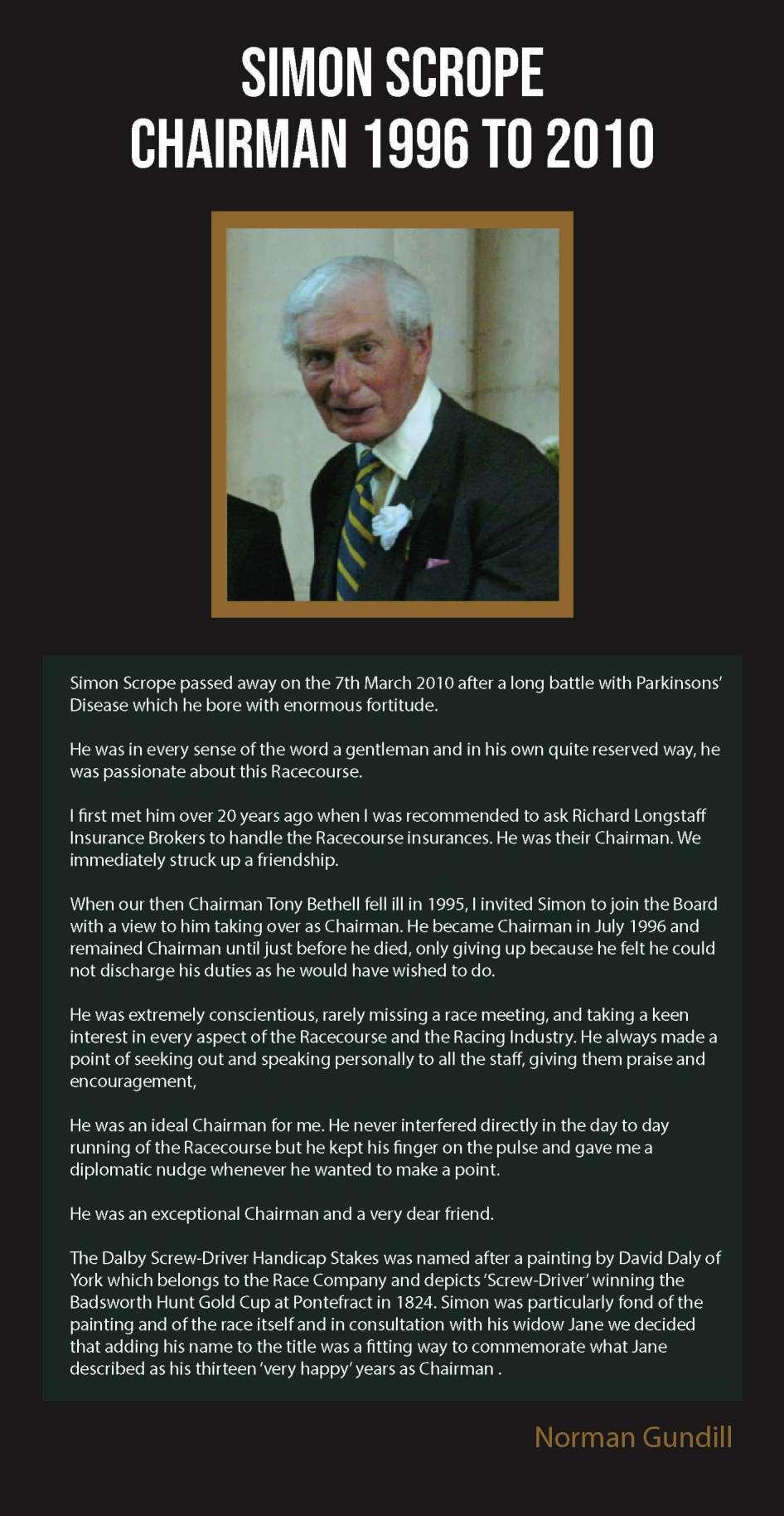 Fourth Race 3.55 - THE SIMON SCROPE DALBY SCREW-DRIVER HANDICAP STAKES (CLASS 3) Distributed in accordance with the Stakes and Prize Money Code. £10800 to the winning horse The second to receive £5070, the third £2536 and the fourth £1268. for three yrs old and upwards, Rated 76-95 (also open to such horses rated 96 and 97; such horses rated 75 and below are also eligible - see Standard Conditions). £50 stake if the horse is rated 76 or higher, or £10 stake if the horse is rated 75 or lower with £40 extra if the horse is declared to run Declare by 10.00 a.m. September 26th. Lowest weight: 4-y-o and up 8st 9lb; 3-y-o 8st 4lb Highest weight: 4-y-o and up 10st; 3-y-o 9st 9lb Penalties, after September 16th, 2023, for each race won 3yo 6lb; 4yo to 6yo 5lb; 7yo and up 4lb. The Challenge Trophy, which has kindly been given for this race by Mrs Jane Scrope, is to be held by the winning owner until September 1st, 2024. A memento will be presented to the owner of the winner of this race In addition a cash prize will also be awarded to the stable employee judged to be in charge of the best turned out horse in this race 12 entries, 0 at £10 and 12 at £50. - Closed September 22nd, 2023. Owners Prize Money. Winner £8534; Second £4266; Third £2134; Fourth £1066. (Penalty Value £10800) Weights raised 1lb and paragraphs 27 to 31 of the Weights and Handicapping Code complied with where applicable. SS