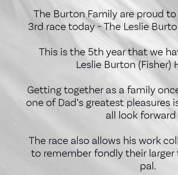 Third Race 3.00 - THE LESLIE BURTON (FISHER) HANDICAP STAKES (CLASS 4) Distributed in accordance with the Stakes and Prize Money Code. £6542 to the winning horse The second to receive £3070, the third £1533, the fourth £767 and the fifth £382. for three yrs old only, Rated 61-80 (also open to such horses rated 81 and 82; such horses rated 60 and below are also eligible - see Standard Conditions). £35 stake if the horse is rated 61 or higher, or £7 stake if the horse is rated 60 or lower with £28 extra if the horse is declared to run Declare by 10.00 a.m. October 7th Lowest weight 8st 4lb; Highest weight 9st 9lb Penalties, after September 30th, 2023, for each race won 6lb. THE BURTON FAMILY have generously sponsored this race and will present a memento to the owner of the winner of this race They will also present a cash prize to the stable employee, judged by them, to be in charge of the best turned out horse in this race 13 entries at £35. - Closed October 3rd, 2023. Owners Prize Money. Winner £5161; Second £2581; Third £1290; Fourth £645; Fifth £323. (Penalty Value £6542.50) SS