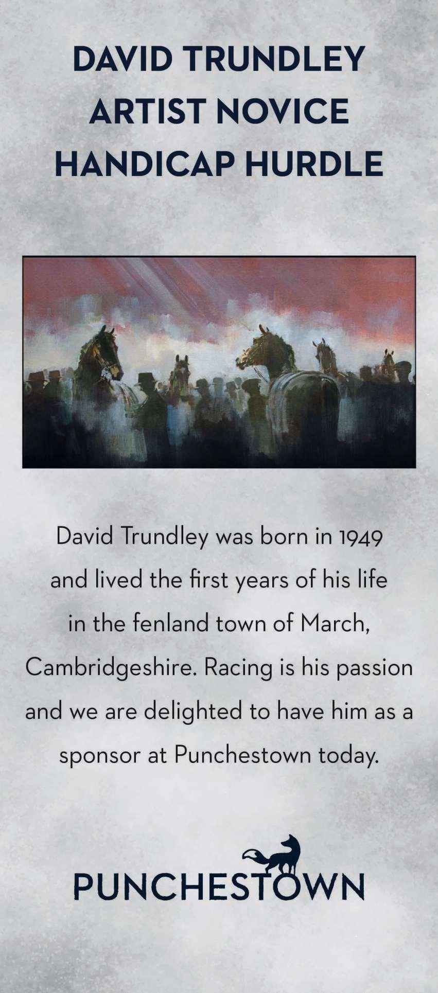 SIXTH RACE 4.02p.m. The David Trundley Artist At Punchestown Novice Handicap Hurdle of €14,500 Winner will receive €8,700 (Penalty Value: €8,555), Second will receive €2,900, Third will receive €1,450, Fourth will receive €725, Fifth will receive €435, Sixth will receive €290 An extended handicap hurdle for four years old and upwards that have not won a hurdle race before 4th May 2025 (120 = 11st 12lbs) About 2 miles 6 furlongs 148 yards €130.50 to enter, €14.50 extra if declared to run. Penalties - Winner of a hurdle race after calculation of the handicap shall carry 7lb extra for each hurdle race won. Handicaps calculated 10th February. Value to winner: €8555; Second: €2900; Third: €1450; Fourth: €725; Fifth: €435; Sixth: €290 SEE PAGE 26 FOR THIS RACE