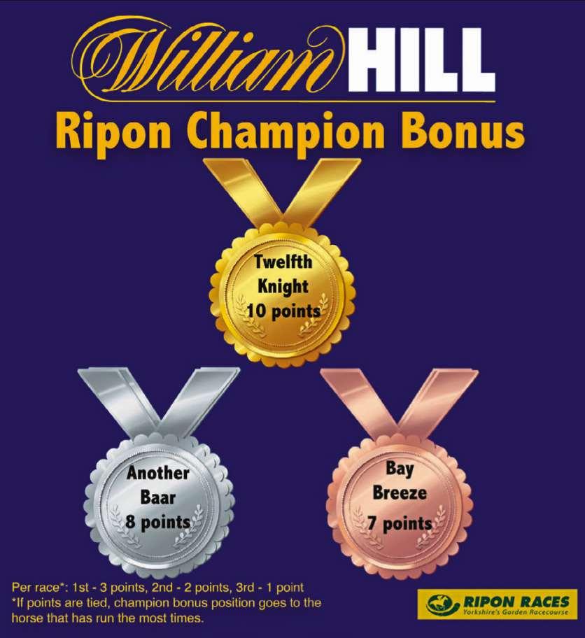 Our inaugural William Hill Ripon Champion Bonus leader is Twelfth Knight who has amassed 10 points with two wins, a second and two third placed efforts from his six runs here this season. Edwina Sheeran could close the gap to just one point should she win the 7.00 race this evening.
