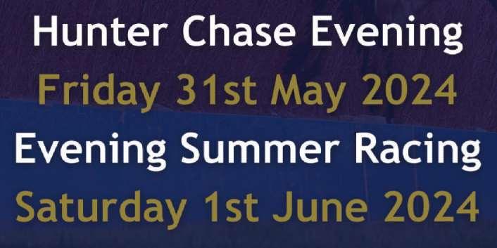 First Race 2.05 - THE WILLIAM HILL EPIC VALUE NOVICES’ HANDICAP STEEPLE CHASE (CLASS 5) Distributed in accordance with the Stakes and Prize Money Code £3775 to the winning horse The second to receive £1737, the third £868, the fourth £434 and the fifth £216. for novice five yrs old and upwards, Rated 0-100. £32 stake if the horse is rated 74 or higher, or £6 stake if the horse is rated 73 or lower with £26 extra if the horse is declared to run Declare by 10.00 a.m. May 17th. Penalties, after May 11th, 2024, for each steeple chase won 7lb William Hill have provided the £50 BTO cash prize to the stable employee responsible for the best turned out horse. 24 entries, 2 at £6 and 22 at £32. - Closed May 13th, 2024. Owners Prize Money. Winner £2888; Second £1444; Third £722; Fourth £361; Fifth £180. (Penalty Value £3775.91) SEE PAGE 14 FOR THIS RACE.
