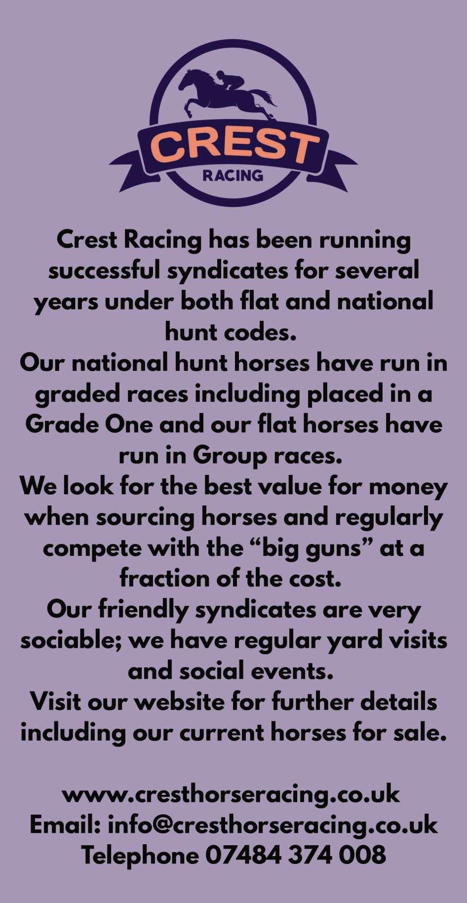 Sixth Race 4.45 - THE CREST RACING MARES’ HANDICAP STEEPLE CHASE (CLASS 5) (Queen Boudicca Mares’ Chase Series Qualifier) Distributed in accordance with the Stakes and Prize Money Code £5967 to the winning horse The second to receive £2745, the third £1372, the fourth £687 and the fifth £342. for five yrs old and upwards mares only, Rated 0-100. Enter by noon, March 18th and pay £56 stake, Declare by 10.00 a.m. March 22nd Penalties, after March 14th, 2026, for each steeple chase won 7lb A memento will be presented to the winning owner and a cash prize of £50 will also be presented to the groom of the best turned out horse Horses which have finished in the first eight in this race will be eligible to enter the £50,000 Queen Boudicca Mares’ Chase Series Final, to be run over 2m 5f 44yds at Fakenham in January, 2027 8 entries at £56. - Closed March 18th, 2026. Owners Prize Money. Winner £4564; Second £2281; Third £1141; Fourth £571; Fifth £285 (Penalty Value £5967.53)