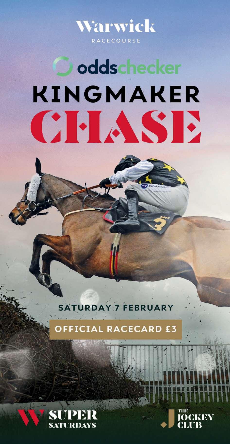 Third Race 1.50 - THE BET SMARTER WITH ODDSCHECKER KINGMAKER NOVICES’ STEEPLE CHASE (CLASS 1) (Grade 2) (GBB RACE) Distributed in accordance with the Stakes and Prize Money Code. £42712 to the winning horse The second to receive £16027, and the third £8025. for novice five yrs old and upwards. Enter by noon, February 2nd and pay £375 stake, Declare by 10.00 a.m. February 5th. Weights: 5-y-o 11st; 6-y-o and up 11st 2lb Mares allowed 7lb Penalties, a winner of a Class 2 weight-for-age or Class 1 handicap steeple chase 3lb Of a Class 1 weight-for-age steeple chase 5lb Oddschecker have generously sponsored this race and will present a memento to the winning owner In addition, they will present a cash prize to the stable employee in charge of the horse judged to be the best turned out. All number cloths to be carried in this race have been sponsored and will carry the name/logo of Oddschecker The sponsorship payment of £500 will be distributed equally amongst all horses starting in this race in accordance with paragraphs 24 to 27 of the Stakes and Prize Money Code. 6 entries at £375 - Closed February 2nd, 2026. Owners Prize Money. Winner £32685; Second £13418; Third £6713. (PenaltyValue £42712.50) A SEE PAGE 15 FOR THIS RACE.