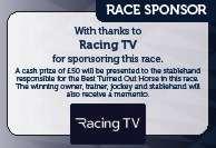 Seventh Race 3.50 - THE WATCH RACE REPLAYS AT racingtv.com OPEN MAIDEN NATIONAL HUNT FLAT RACE (CLASS 5) (Category 3 Elimination) (DIV I) (GBB RACE) Distributed in accordance with the Stakes and Prize Money Code. £2639 to the winning horse The second to receive £1214, the third £607, the fourth £303 and the fifth £151. for maiden four, five and six yrs old only, which have not run under any recognised Rules of Racing, except National Hunt Flat races, Irish National Hunt Flat races or French AQPS Flat races Enter by noon, January 27th and pay £24 stake, Declare by 10.00 a.m. January 30th.Weights: 4-y-o 10st 9lb; 5-y-o and 6-y-o 11st 7lb Fillies and mares allowed 7lb The Riders’ Allowances under paragraph 53 of the Weights and Handicapping Code may be claimed in this race WETHERBY RACECOURSE & CONFERENCE CENTRE will present a memento to the winning owner 19 entries at £24. - Closed January 27th, 2025. Owners Prize Money. Winner £2019; Second £1009; Third £505; Fourth £252; Fifth £126. (Penalty Value £2639.97) SEE PAGE 16 FOR THIS RACE.