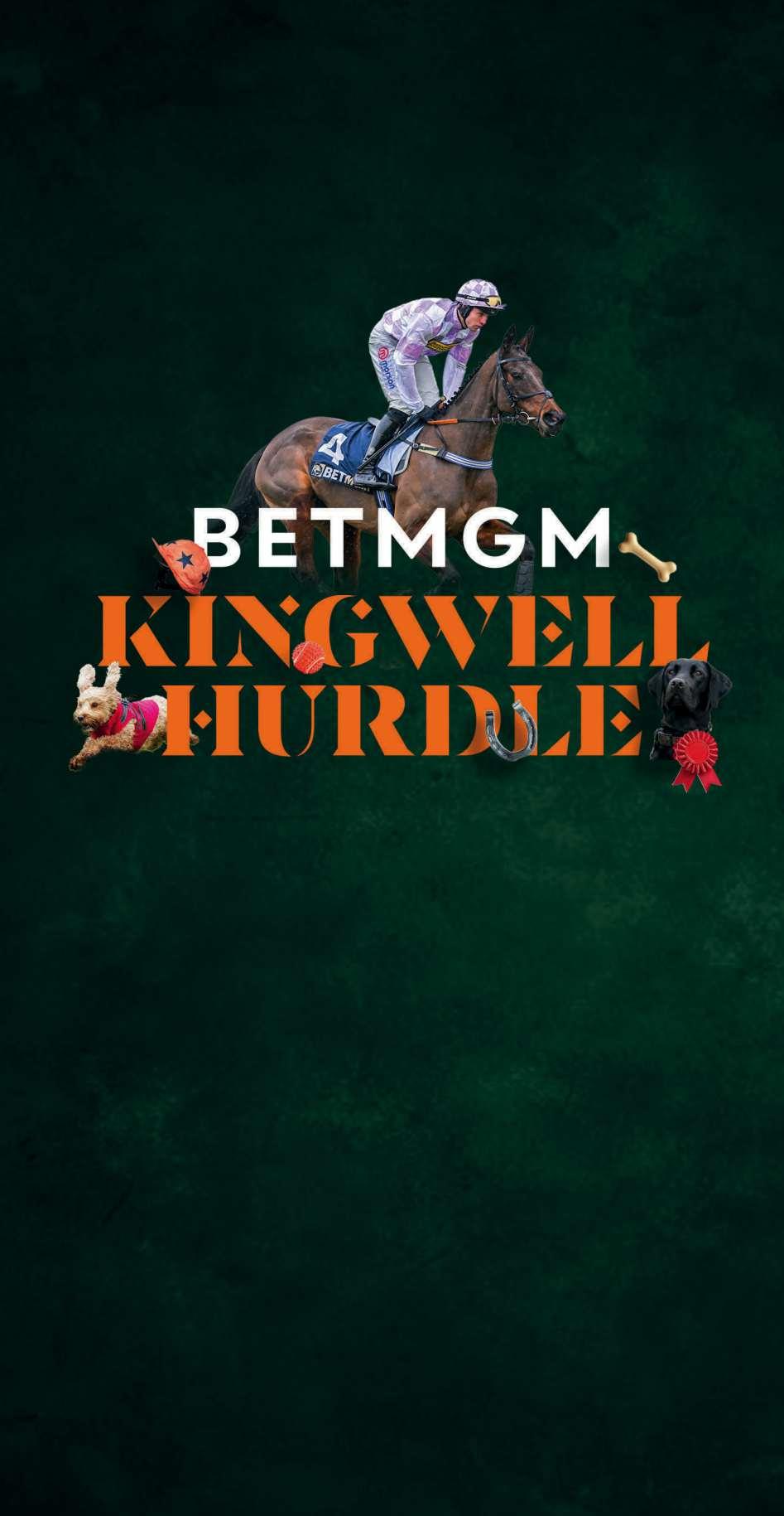 Third Race 1.35 - THE BETMGM KINGWELL HURDLE RACE (CLASS 1) (Grade 2) (GBB RACE) Distributed in accordance with the Stakes and Prize Money Code. £41608 to the winning horse The second to receive £15582, the third £7784 and the fourth £3885. for four yrs old and upwards, which are allotted a rating or an assessment of 120 or more by the BHA Handicapper, taking account of races run up to and including the day prior to entry Enter by noon, February 9th and pay £350 stake, Supplementary Entry by noon, February 11th and pay £1608 stake, Declare by 10.00 a.m. February 12th. Weights: 4-y-o 10st 6lb; 5-yo and up 11st 4lb Fillies and mares allowed 7lb Penalties, after September 30th, 2024, a winner of a Listed or Premier Handicap/ Grade 3 hurdle race 4lb Of a Grade 1 or Grade 2 hurdle race 6lb (Half penalties forwins achieved in Novices’ orJuvenile Hurdle Races in Great Britain and Ireland, and three-year-old only Hurdle Races in France) No allowance to take a Horse’s weight below 10st 2lb BetMGM have generously sponsored this race and will present a memento to the winning owner In addition, they will present a cash prize to the stable employee in charge of the horse judged to be the best turned out. All number cloths to be carried in this race have been sponsored and will carry the name/logo of BetMGM The sponsorship payment of £500 will be distributed equally amongst all horses starting in this race in accordance with paragraphs 24 to 27 of the Stakes and Prize Money Code. 7 entries at £350 - Closed February 9th, 2026. Owners Prize Money. Winner £31934; Second £13055; Third £6524; Fourth £3262. (PenaltyValue £41608) A SEE PAGE 13 FOR THIS RACE.