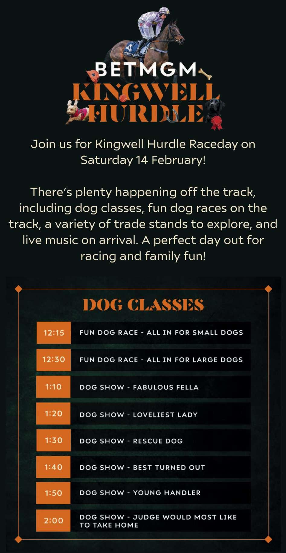 Our next raceday is Saturday 14th February, BetMGM Kingwell Hurdle Day, headlined by the Grade Two Kingwell Hurdle, an important trial for the Unibet Champion Hurdle at the Cheltenham Festival, as demonstrated by 2025 winner Golden Ace. This raceday will also feature our dog-friendly event, with dog shows across six fun classes, exciting dog races, and fashions trade stands Daltons England, Bishop and Haig and Tweed and Country, making it a perfect day out for all the family