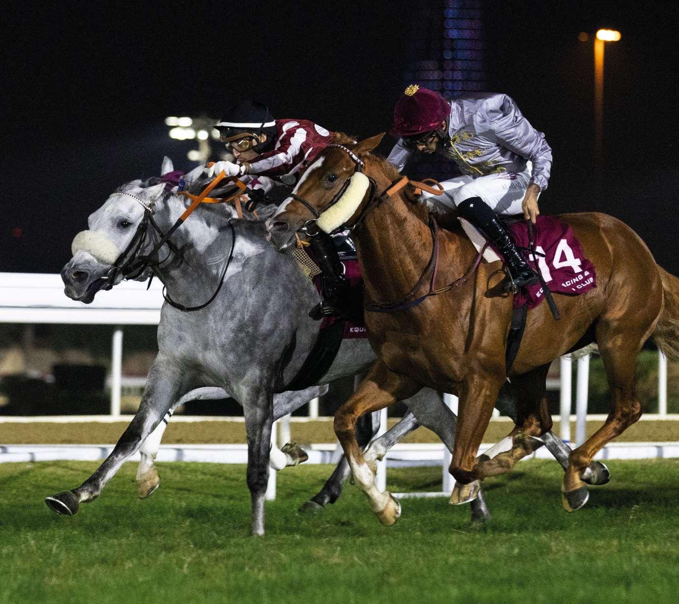 In the earlier Arabian races over 1750m, there was success for the brothers, Mohammed and Abdullah bin Fahad Al Attiyah, whose winners were both trained by Alban de Mieulle. Mohammed Bin Fahad Al Attiyah’s homebred filly Sahab responded well to pressure from jockey Maxime Guyon to win by a cosy half-length in the HE Sheikh Joaan bin Hamad Al Thani Trophy for four-year-olds. It was her first win since arriving in Doha from France, and she left the colts, Hassan Ali Alabdulmalik’s Nirond and Jassim Mohammed Al-Darwish’s Falaah, to fill in the places in a close finish.