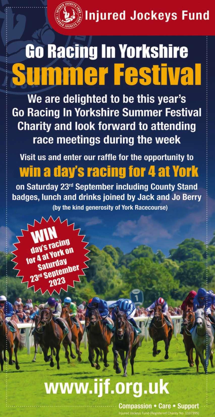 We are proud to bring the wonderful extended week of the Go Racing in Yorkshire Summer Festival 2023 to its finale Now in its fifteenth year, and firmly established thanks to the generous and loyal backing of our week-long sponsors, Sky Bet and Goldsborough Hall. The festival serves to showcase the best the sport has to offer in the County In Yorkshire we have nine superb racecourses, over 100 training yards, the National Racing College, Jack Berry House and Goffs Bloodstock Sales, all making for a successful racing industry in the county See if Sabrina Wiegman should have picked any of the jockeys, as they play “Paddock & Chips” at 1pm in the Parade Ring, all for the good cause of Jack Berry House