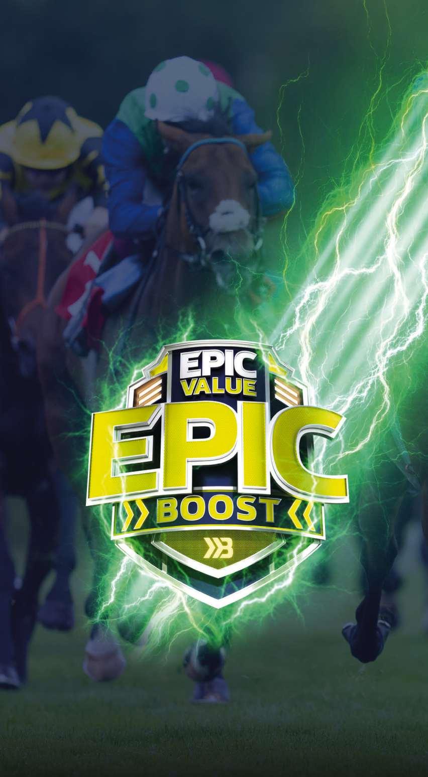 EPIC Boost ANY HORSE. ANY RACE. EPIC BOOST. Opt in required. 1 EPIC Boost per customer expires Sunday 23:59 Max Stake £5 single or £5E/W. On E/W bets, only“win”part boosted. Selected customers only. Full T&Cs apply Over 18s only For advice and information visit begambleaware.org National Gambling Helpline 0808 8020 133