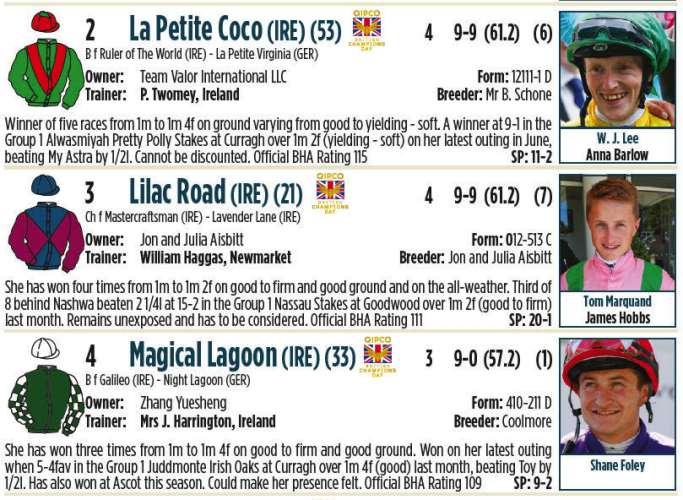 8-1 Miss Information (IRE), 9-1 Alfa Kellenic (GB), 11-1 Arisaig (GB), 12-1 Queen of Mougins (IRE), 14-1 Elim (IRE), Key To Cotai (IRE), Sunfall (GB), Coppull Hall Lane (GB), 16-1 Nine Tenths (IRE), Raknah (IRE), 18-1 Back See Daa (GB), Queen’s Reign (GB), 22-1 Pinafore (IRE), 25-1 Aquacell (IRE), 28-1 International Girl (IRE), Mereside Diva (IRE), Rock Melody (IRE), 50-1 Enola Grey (IRE)