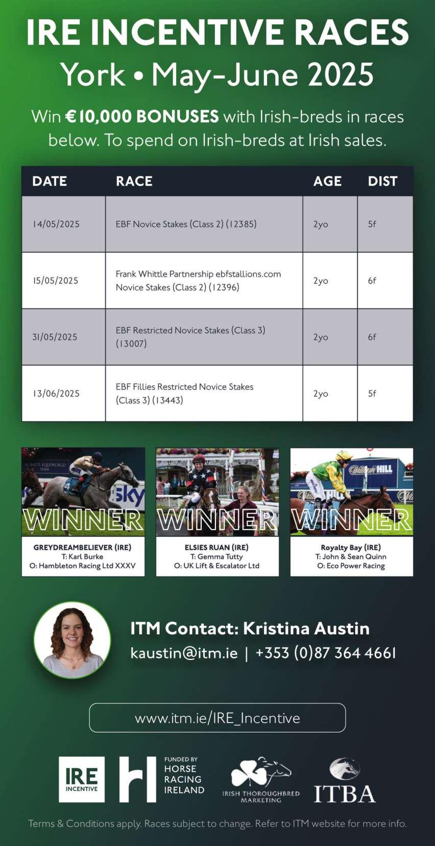 (CLASS 3) Distributed in accordance with the Stakes and Prize Money Code £12885 to the winning horse The second to receive £6042, the third £3022, the fourth £1510, the fifth £755 and the sixth £377 for novice two yrs old, which are E.B.F eligible, which are in Bands A, B, C, and D. Enter by noon, May 26th and pay £125 stake, Declare by 10.00 a.m. May 29th. Weights: Colts and geldings 9st 4lb; fillies 8st 13lb Penalties, a winner of a race 5lb Of 2 races 8lb (Sellers and Claimers excluded for the purposes of penalties) Allowances: Band B from Band A 2lb Band C from Band B 2lb Band D from Band C 2lb (Allowances are cumulative) IRISH THOROUGHBRED MARKETING have generously sponsored this race and will present a memento to the winning owner THE TRUSTEES OF THE BRITISH EUROPEAN BREEDERS’ FUND have also kindly contributed £1000 towards the prize money for this race. The European Breeders’ Fund support 151 Flat races each year across Yorkshire; boosting prize money by over £500000 Each year, the British EBF contributes up to £2million to Flat and National Hunt racing nationwide All horses which are placed in the first six in an EBF Restricted Maiden or Novice race qualifier in 2025 will be qualified to run in either THE £100,000 EBF RESTRICTED RACE FINAL (CLASS 2) (for fillies only) at Goodwood on 24 September, 2025, or THE £100,000 EBF RESTRICTED RACE FINAL (CLASS 2) (for colts and geldings only) at York on 10 October, 2025 Both races will be run over seven furlongs. NOTE: Horses entered or declared in a race which is subsequently abandoned will not be eligible to enter a Final. For details on bandings and auction values, please refer to the BHA’s Racing Admin website (www2.racingadmin.co.uk). 24 entries at £125 - Closed May 26th, 2025 Owners Prize Money. Winner £10158; Second £5080; Third £2540; Fourth £1270; Fifth £635; Sixth £318 Penalty Value: £12885 Weights raised 3lb and paragraphs 27 to 31 of the Weights and Handicapping Code complied with where applicable SS For race details see page 35