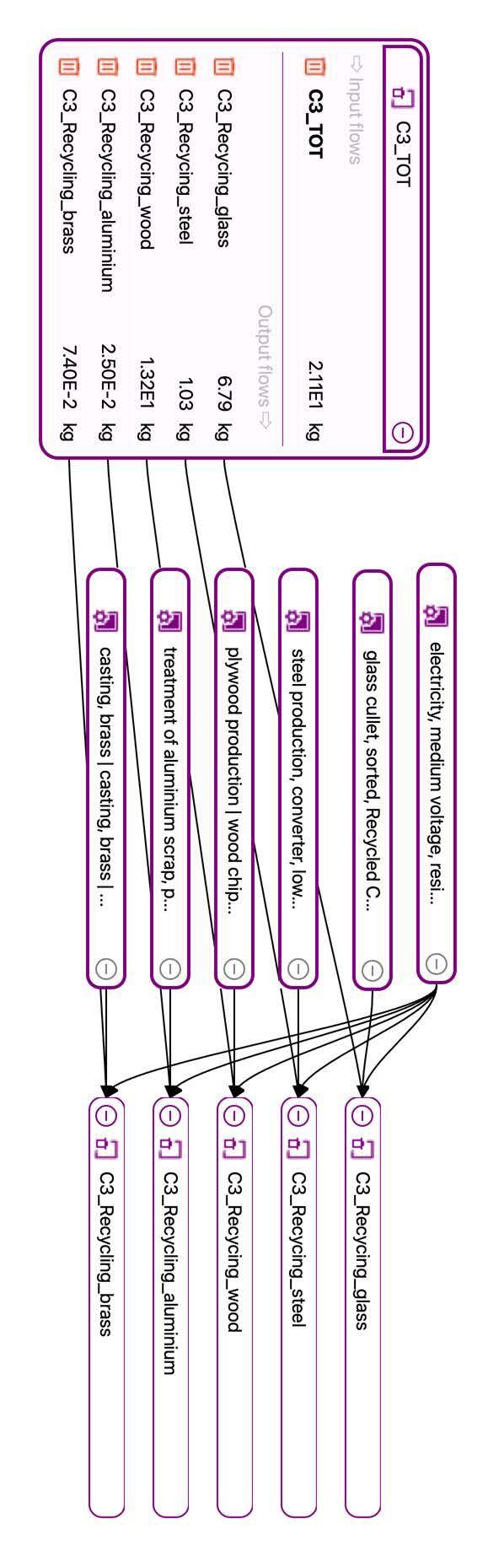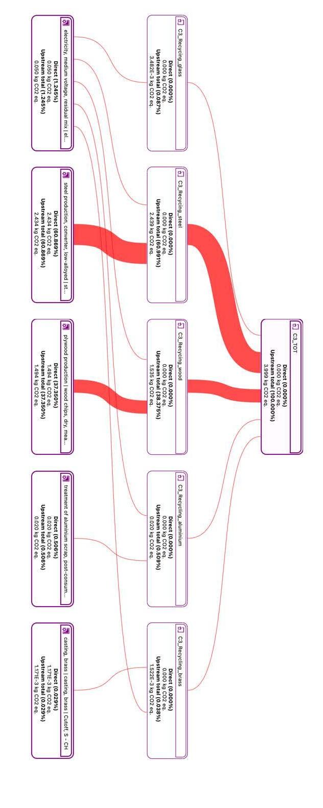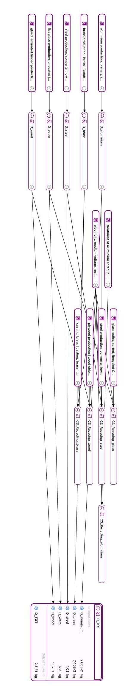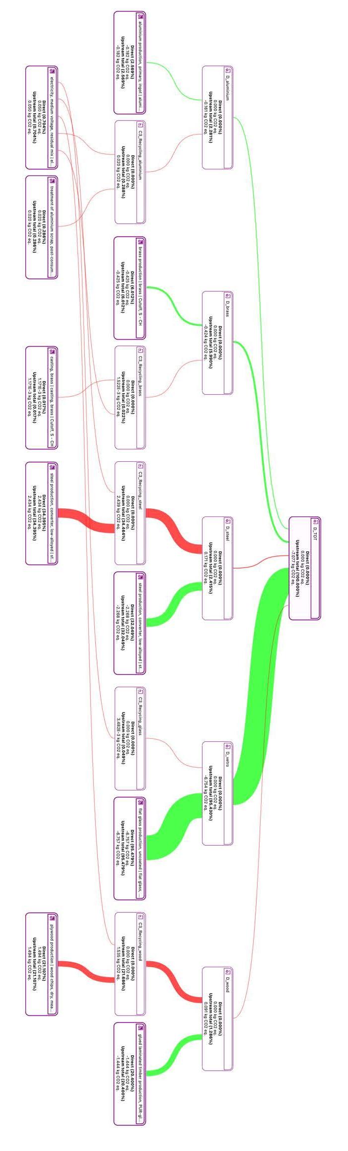 Table 28 presents the aggregated values of the phases A1-A3, A4, A5, the impacts of the end-oflife phase C1, C2, C3, C4 modules and the environmental benefits D relating to the sector average. All results are relative to the declared unit of 1 m2 of a window. Specifically, for the description of the end-of-life modules, it was assumed that all the material is recovered (35.30 kg per 1 m2 of window). The EoL scenario considered is the following one: