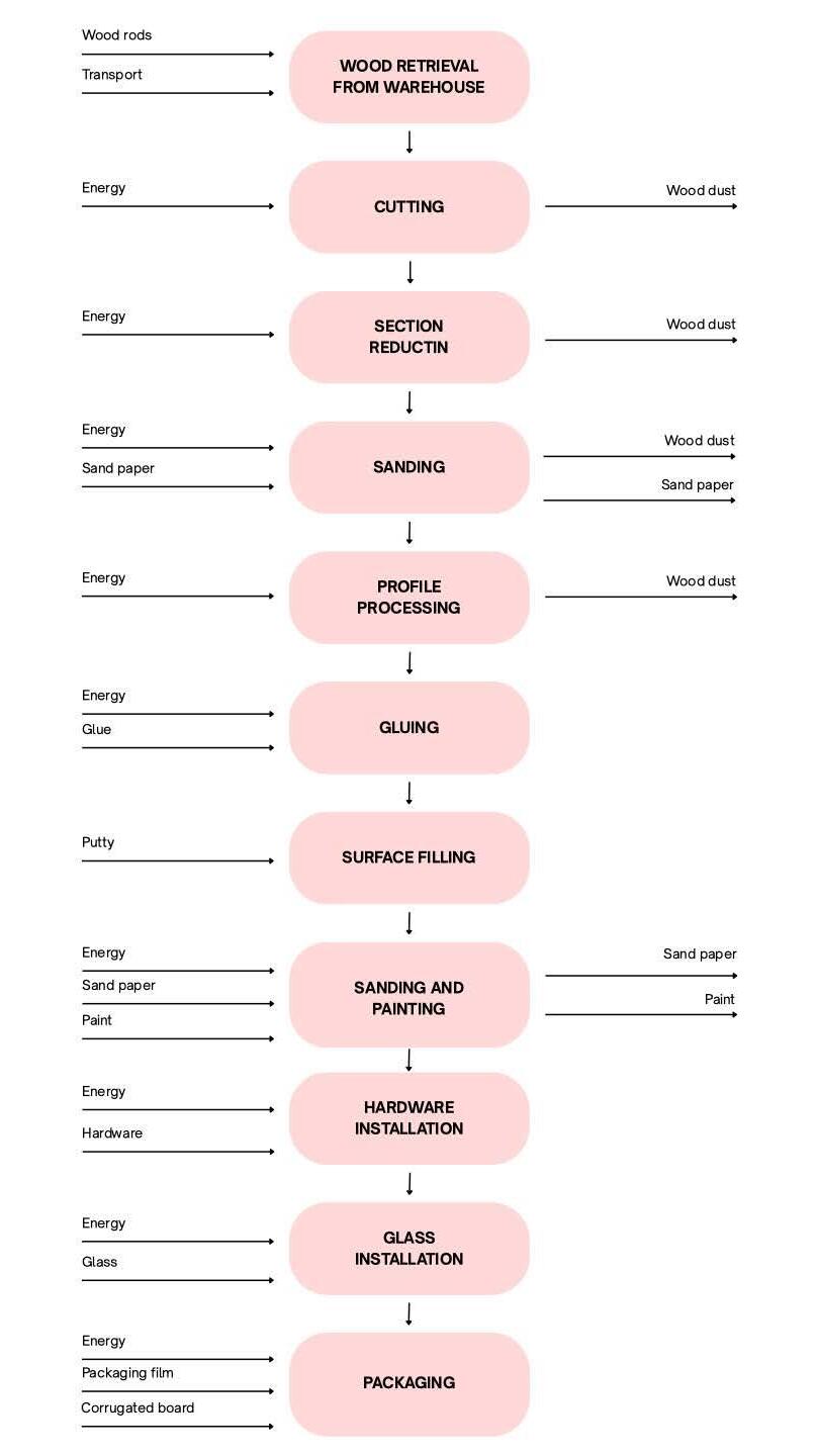 Il Sistema analizzato, dall’estrazione delle materie prime fino al fine vita, si è basato su dati raccolti principalmente in azienda (2024–2025), su un processo produttivo di 13 fasi, dal taglio e incollaggio del legno alla verniciatura, assemblaggio ferramenta e vetro, fino all’imballaggio e all’installazione.