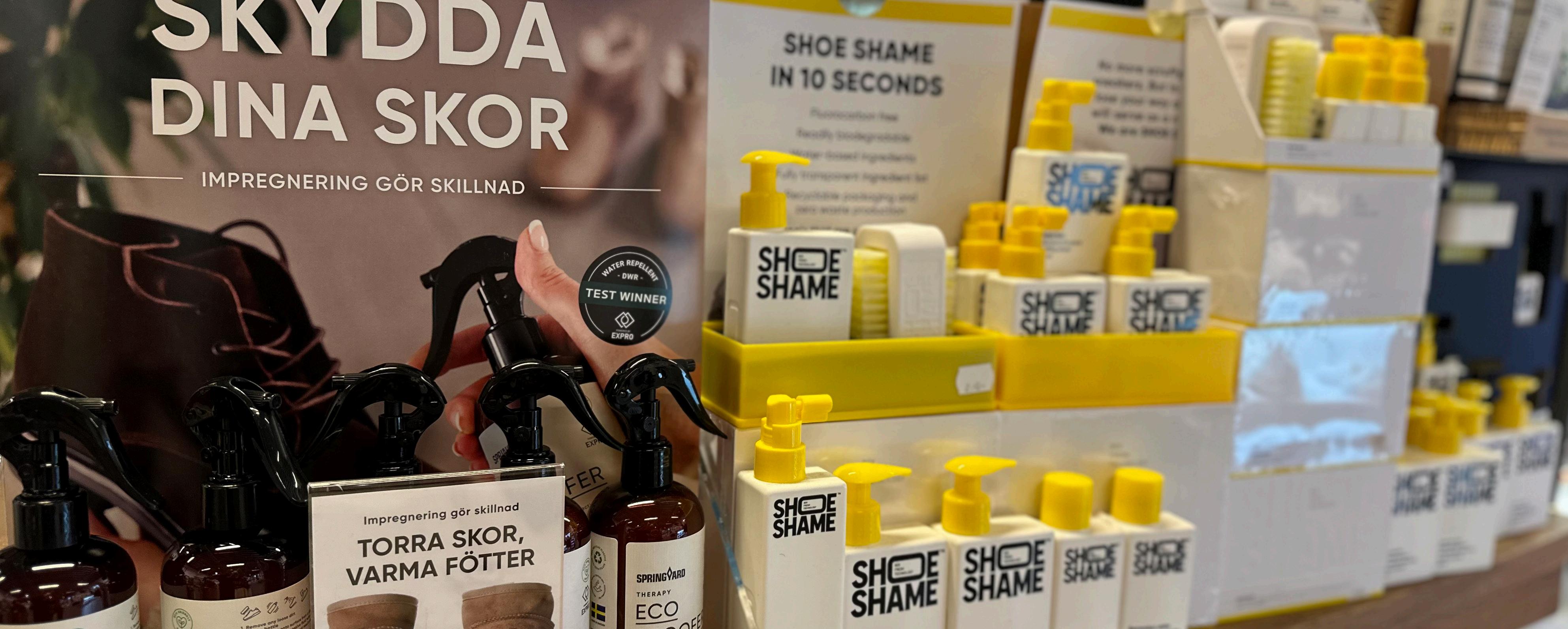 Ett sista tips: ha skovÄrden framme i hallen sÄ du inte glömmer. Helena rekommenderar en vattenbaserad impregnering frÄn Springyard som Àr doftfri och giftfri, vilket gör den smidig att anvÀnda inomhus och snÀll mot barn, djur och natur. Behöver du hjÀlp att vÀlja rÀtt borste, krÀm eller spray? Titta in sÄ guidar de dig.