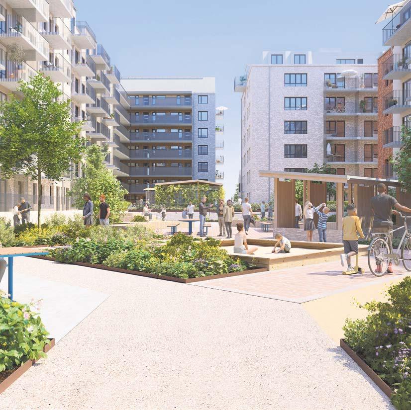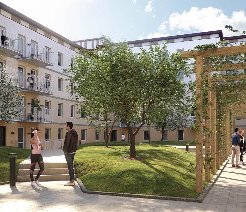En viktig del i projektet är gårdsmiljön. Här planeras gemensamma funktioner som växthus, uppehållsrum och gemensam pool för alla boende. Marklägenheterna får egna uteplatser