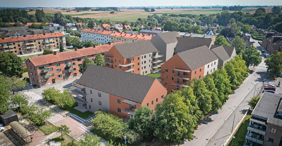 tegelfasad och kringbyggd innergård med atrium. Parkeringsgarage under gårdsplan ska betjäna både boende och kunder. Läget ger närhet till bussförbindelser, skola, idrottshall samt Råbylundssjön och rekreationsområden cirka 200 meter från fastigheten. – Behovet av hyresbostäder finns alltid. Vi vill erbjuda ett enkelt och flexibelt boende där det ska vara smidigt och tryggt att bo hos oss, säger Pehr Carlberg ■