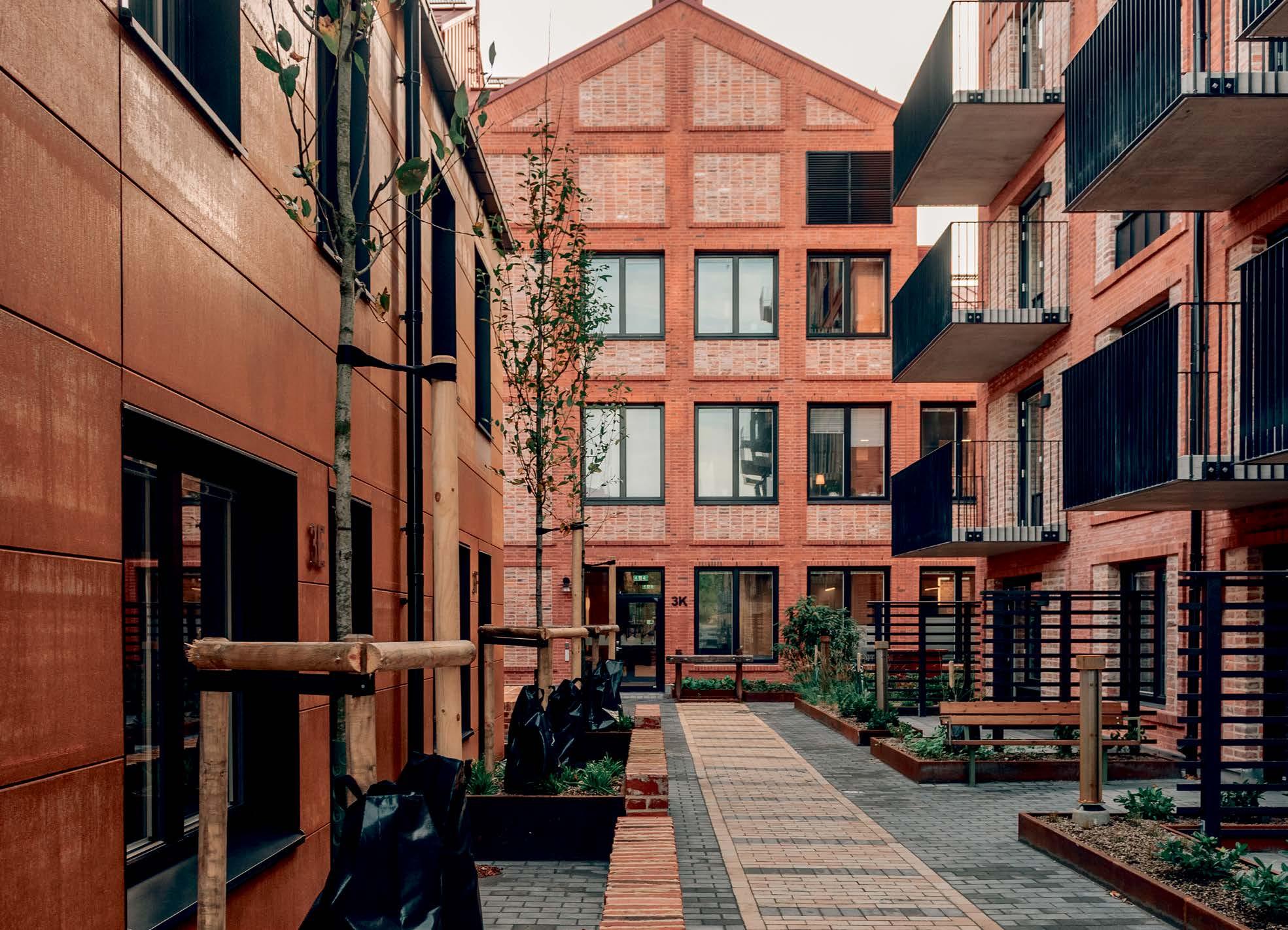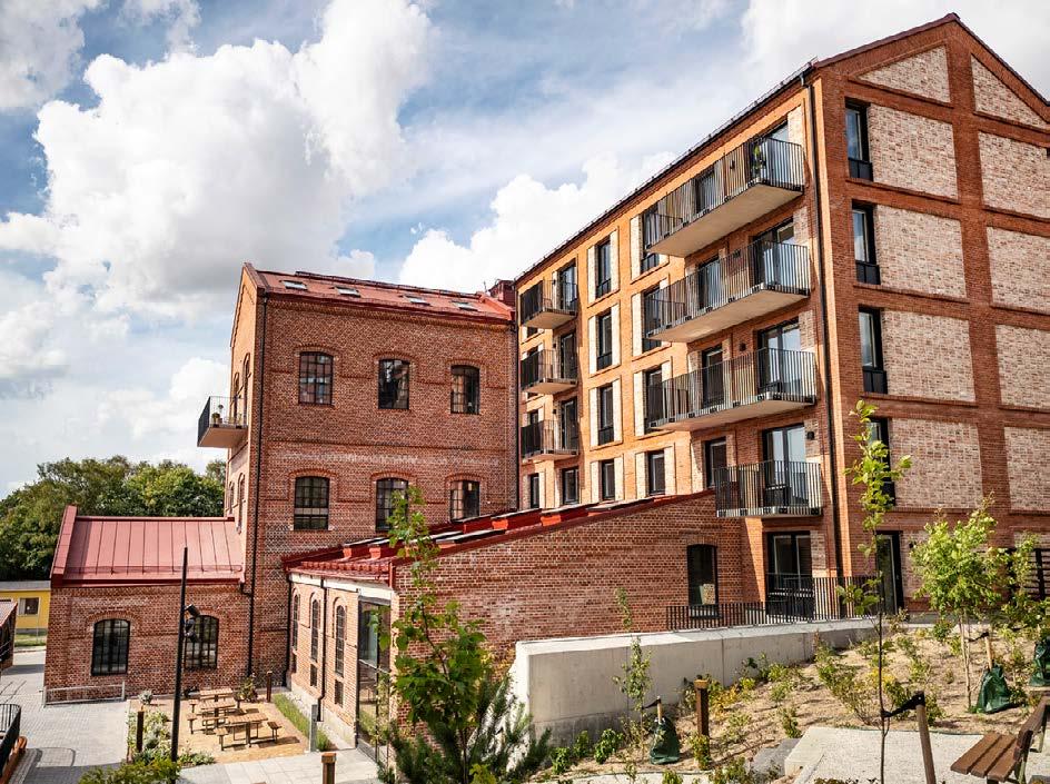 Den Q-märkta industribyggnaden är nu hem för både boende och arbetsplatser. Rött tegel och bevarade detaljer möter modern arkitektur i ombyggda Spritfabriken, som nu är en del av Eslövs framtid.