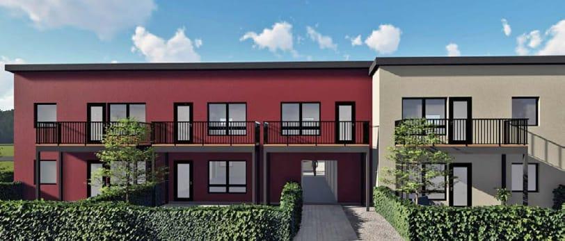 Det putsade tvåvåningshuset kommer att rymma lägenheter i storleken två till fyra rum och kök, samtliga med uteplats eller balkong. Modulhuset får putsad fasad och utrustas med egenproducerad energi i