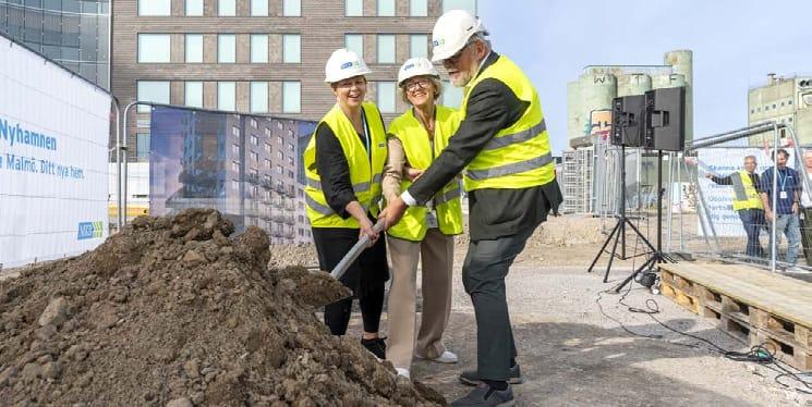 Katrin Stjernfeldt Jammeh (S), ordförande i kommunstyrelsen, Marie Thelander Dellhag, vd på MKB Fastighets AB och Leif Jakobson, MKB:s styrelseordförande tog det första spadtaget för skyskrapan på 19 våningar.