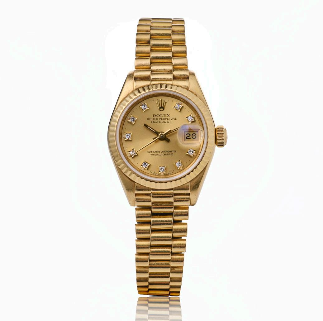 Dial and Hands: Champagne dial with factory-set diamond hour markers and luminous gold baton hands.
