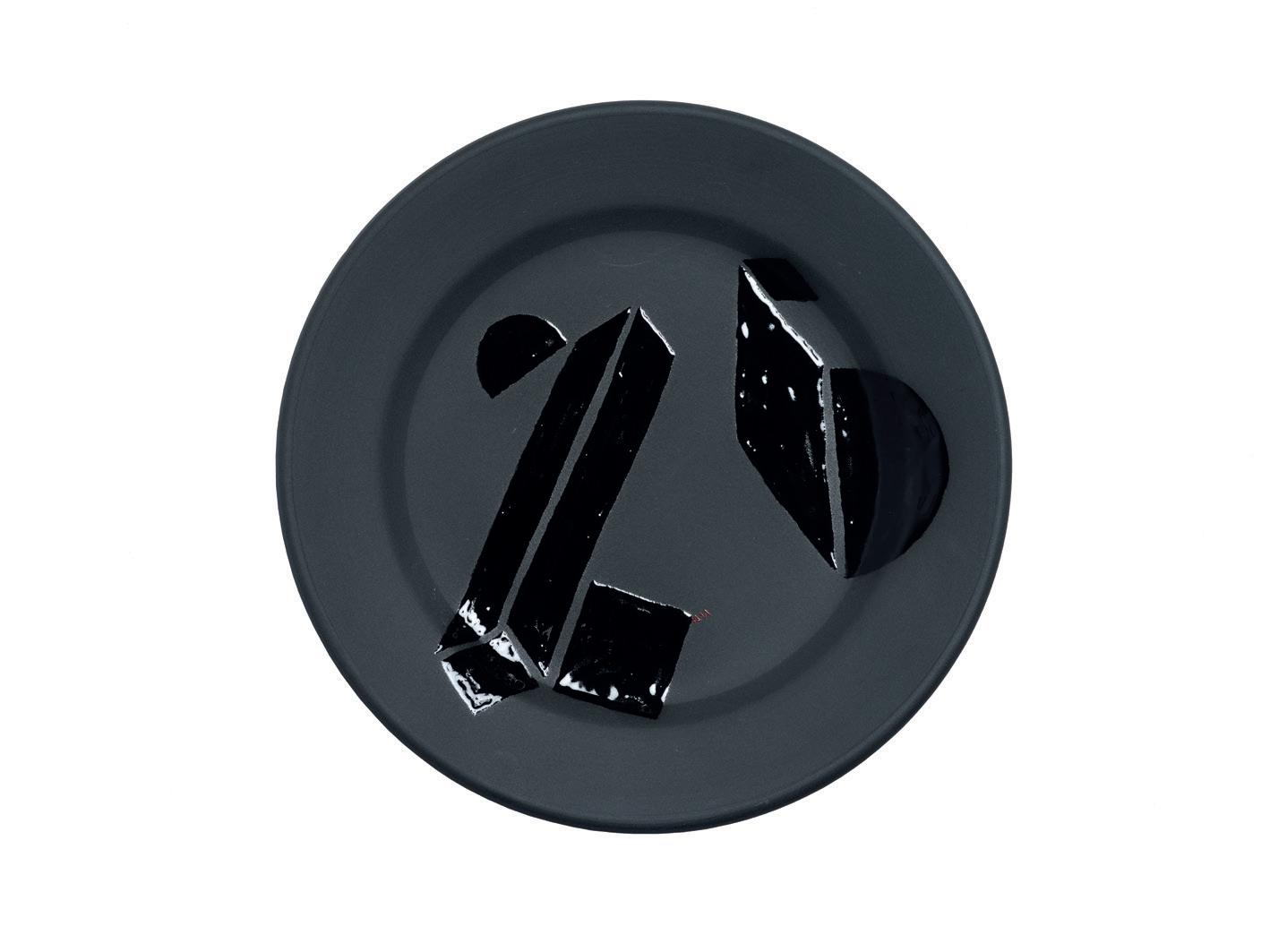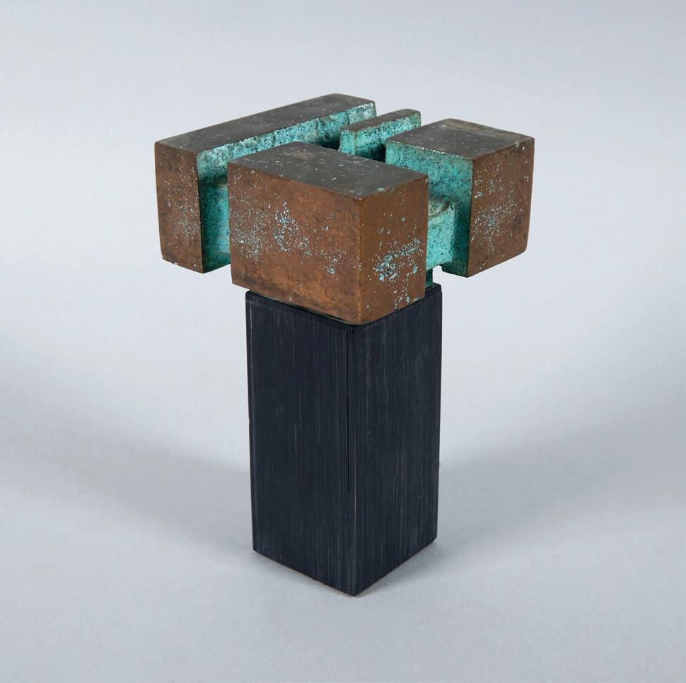 to create unique work. McLeod’s Plate 7, 6, 5, 4 recasts a dining plate as a painting support. Though it is painted sparingly, presented stripped back geometric forms in a glossy black. Ngan’s 135 is a small-scale bronze sculpture with a wooden base. It employs similar geometric forms to his larger works, though on a restrained scale. Both works make optimal use of tightly parsed materials.