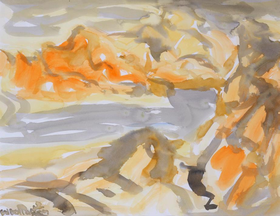 Toss Woollaston is rightly remembered as a central figure in the development of modern art in New Zealand. A formative painter of post-war New Zealand art, his name is often mentioned in the same breath as Colin McCahon’s. Woollaston’s highly expressive paintings capture the essence of South Island landscape without consistantly referencing a specific place. He was a master of creating paintings that hovered between landscape and abstraction — often with just enough suggestion of a hilly horizon or a river valley to hold together. A few tweaks or different brushstrokes would see his paintings read as abstract gestural scrawls, rather than landscapes. These two paintings, both watercolours, walk that delicate line to perfection.