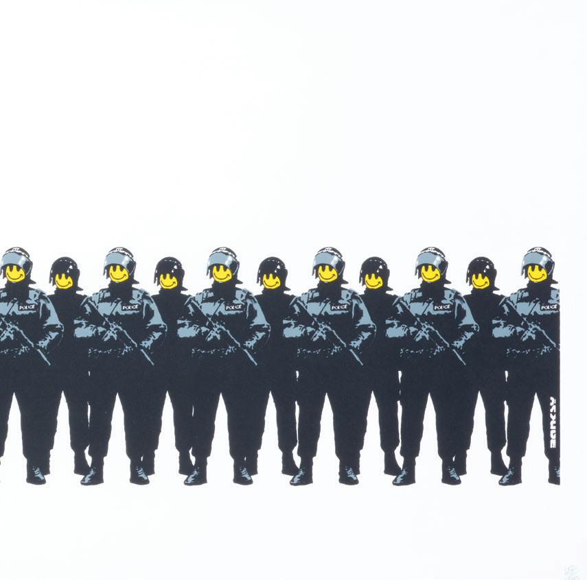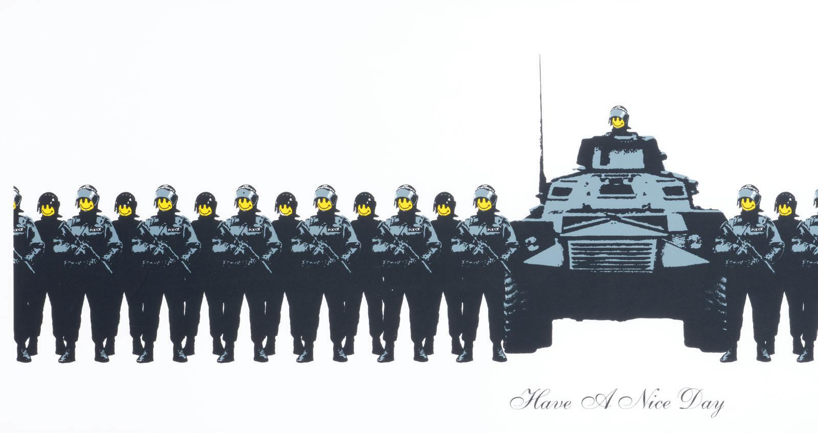 Banksy has produced various limited edition print runs in a similar visual style to his street art stencil works. Have a Nice Day ironically depicts an imposing line up of heavily armed military police with cartoonish smiley faces. The smiling faces and pleasant sentiment of the title starkly contrasting the lurking authoritarian threat of the armed officers.