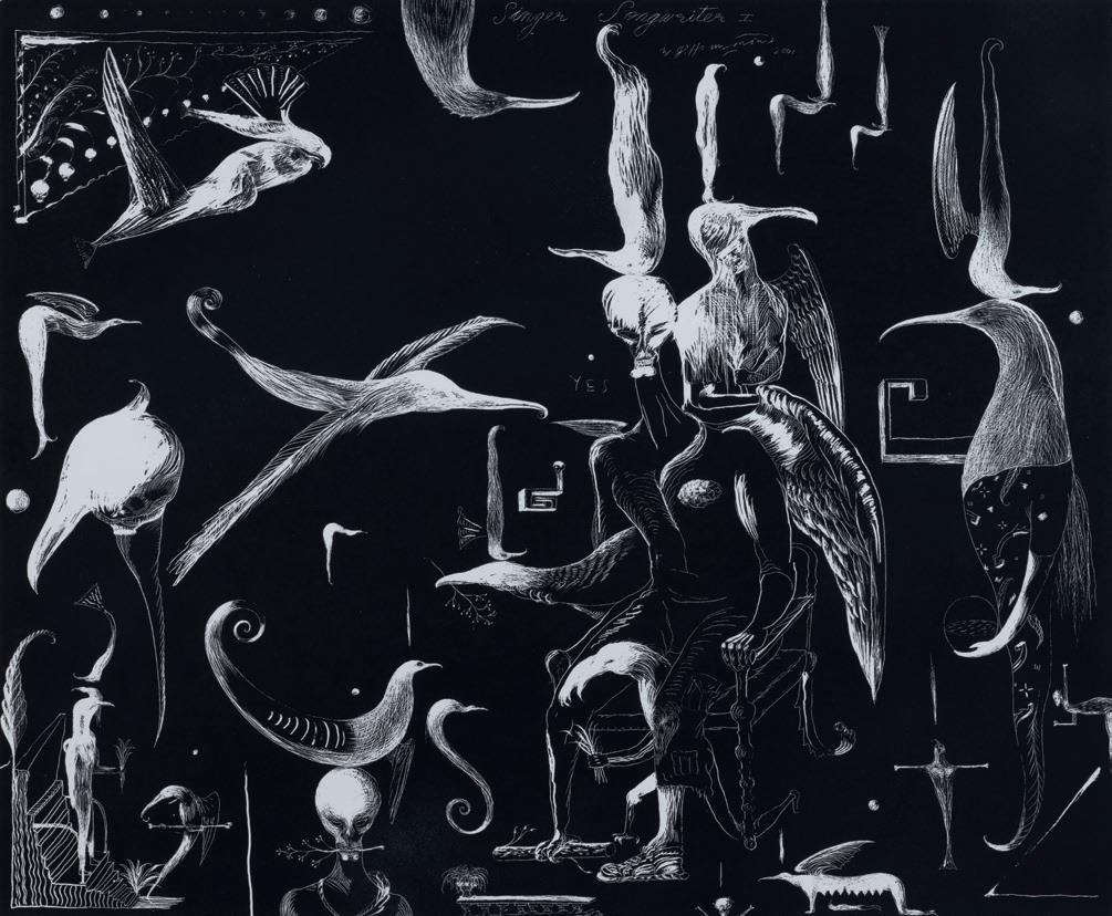 The late Bill Hammond is one of New Zealand’s most celebrated artists. His iconic depictions of anthropomorphic birds are among the most recognisable motifs in New Zealand art. Underpinning his great success as an artist was his exceptional skill in drawing and constructing images. This skill is plainly evident in these two works, Singer Songwriter I and an untitled