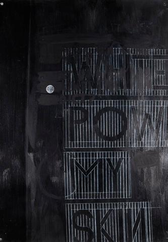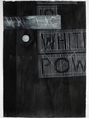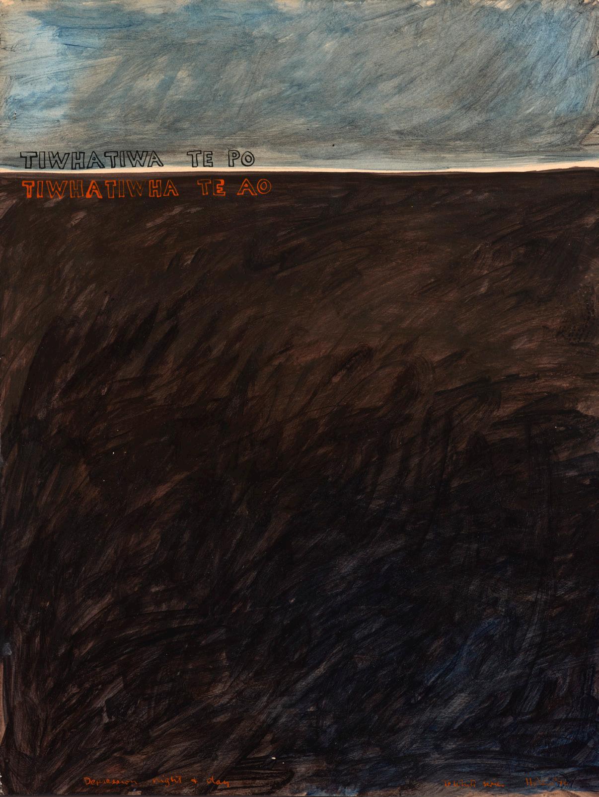 layered graphite drawing that features Hotere’s distinctively expressive hatching, worked back in areas with an eraser. Depression Night and Day (Te Whiti series) is a striking acrylic painting. The paint work has similarities to the graphite in Window in Spain, Madrid, with evocative gestural marks, layered up to achieve a sense of movement, energy and space.