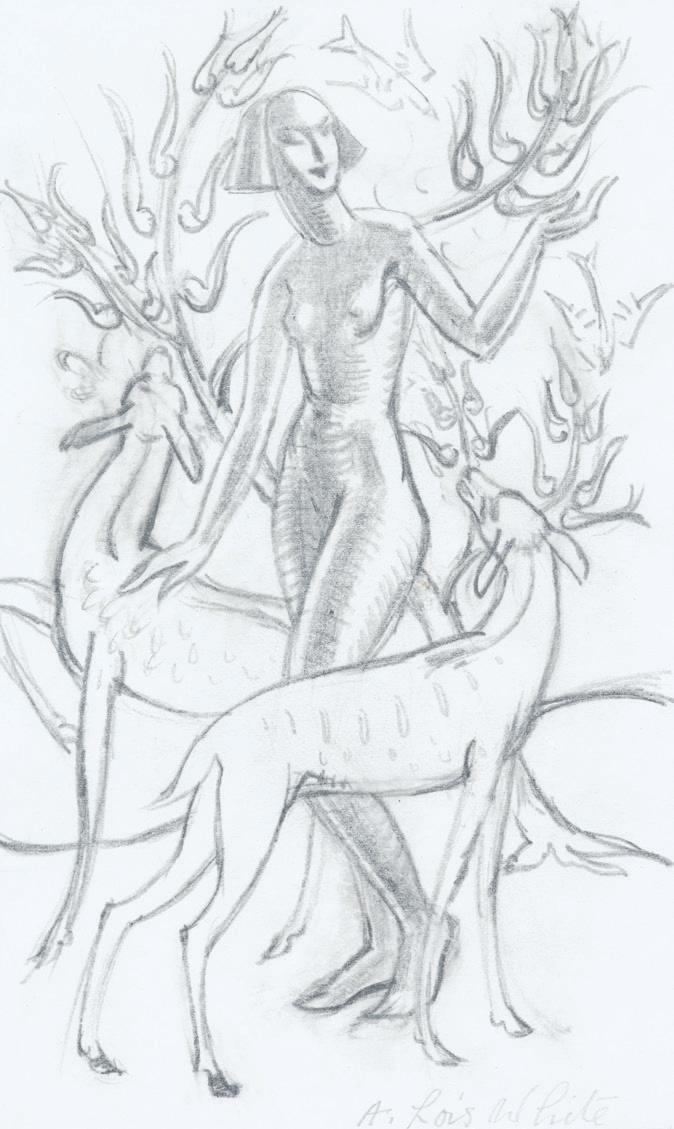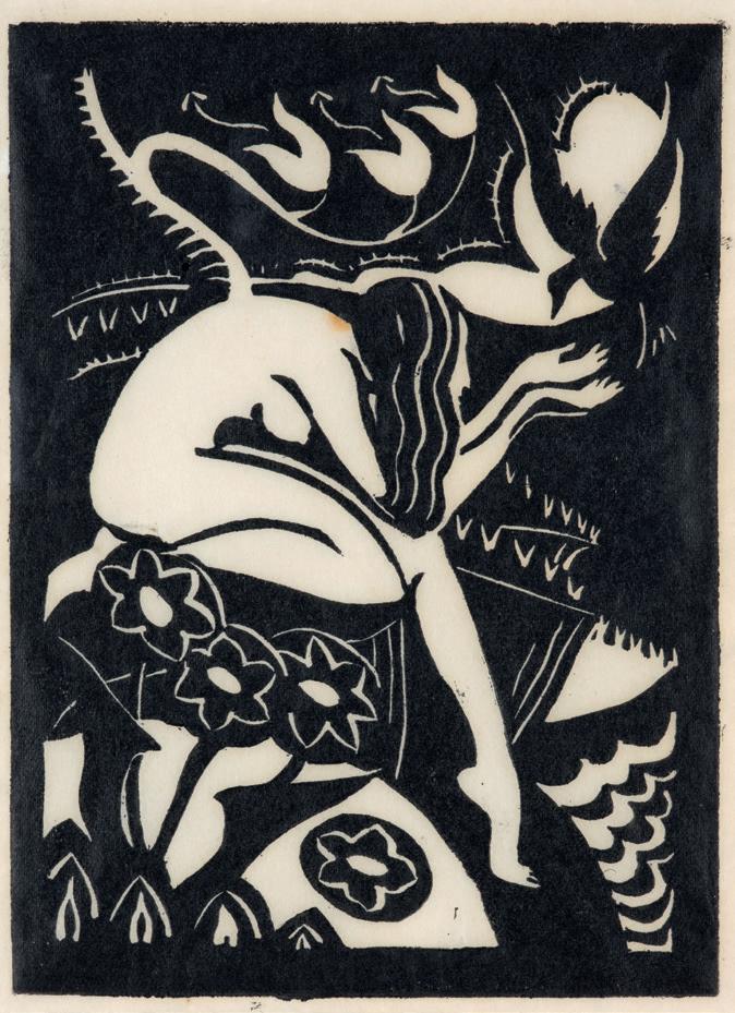 The work of A. Lois White is notable for its distinctive graphic style and strong design sensibility. White was active in art making from the 1920s through to the 1970s, creating a rich body of paintings, drawings, and prints. She created portraiture and landscape work, which often explored biblical and political themes. White’s art fell out of fashion in the 1950s, though she continued to work diligently until the later stages of her life. In the 1970s, art dealer Peter McLeavey presented a show of her paintings, that brought her back to national attention. The two works presented here, a graphite drawing and a woodcut, are demonstrative of White’s compositional finesse.