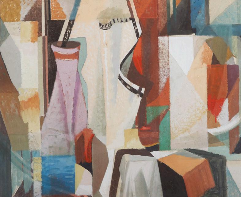 John Drawbridge created a substantial body of work over the course of his life. He was well-known as a painter and muralist, and as a superb printmaker. His work often explored formalist themes, and thoughtfully engaged with international ideas of modernism. The two works included in this catalogue share a similar palette. One is a watercolour and pastel work on paper from 1989. The image is satisfying balanced, composed of interlocking geometric segments. The still life referred to in the title, perhaps underlying the image, has been abstracted beyond recognition. Still Life with Malevich (Red) follows a similar theme, though the still life aspect is more identifiable — even if comprised of geometric shapes that appear to acknowledge the work of Russian Suprematist maestro Kazimir Malevich.