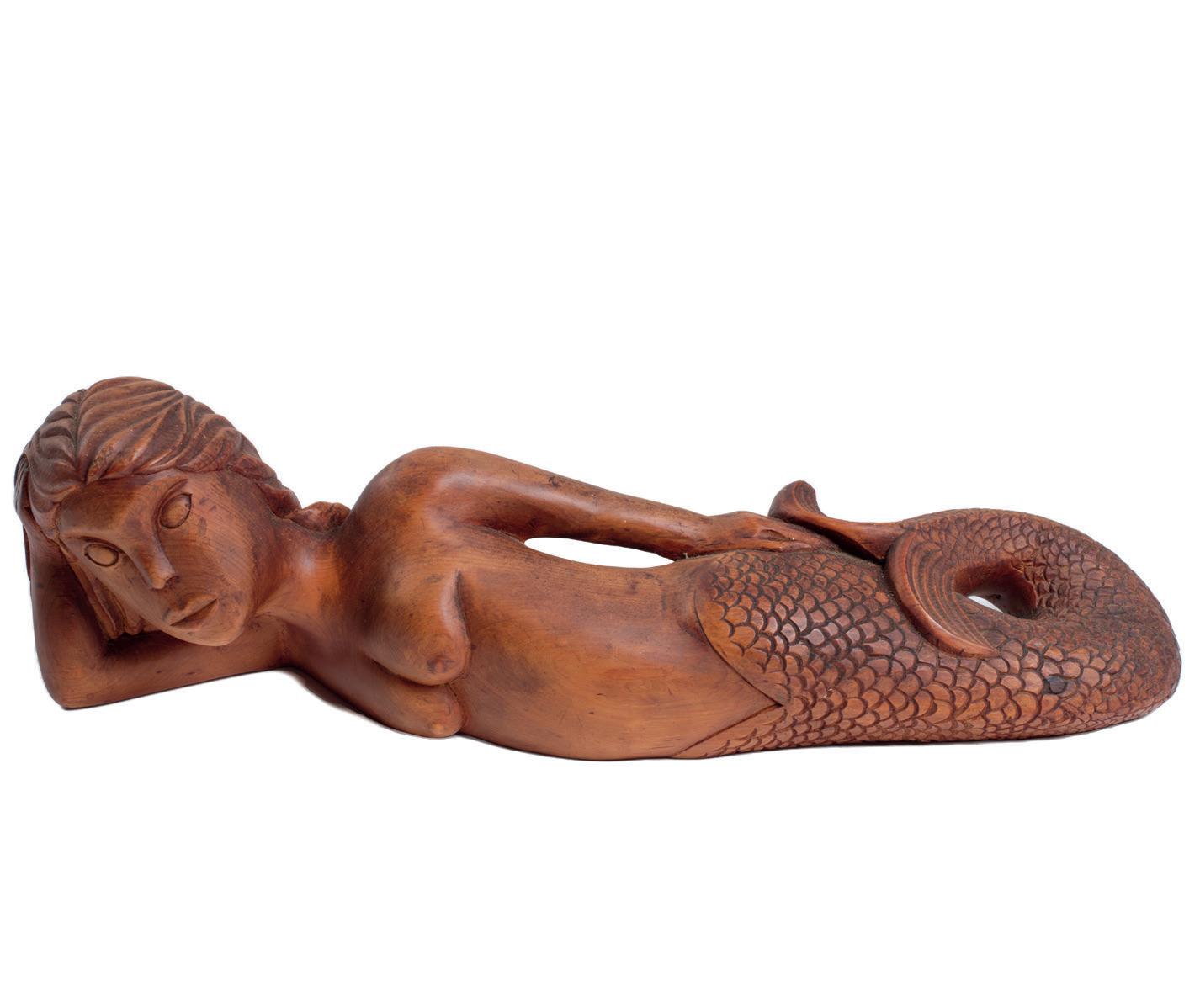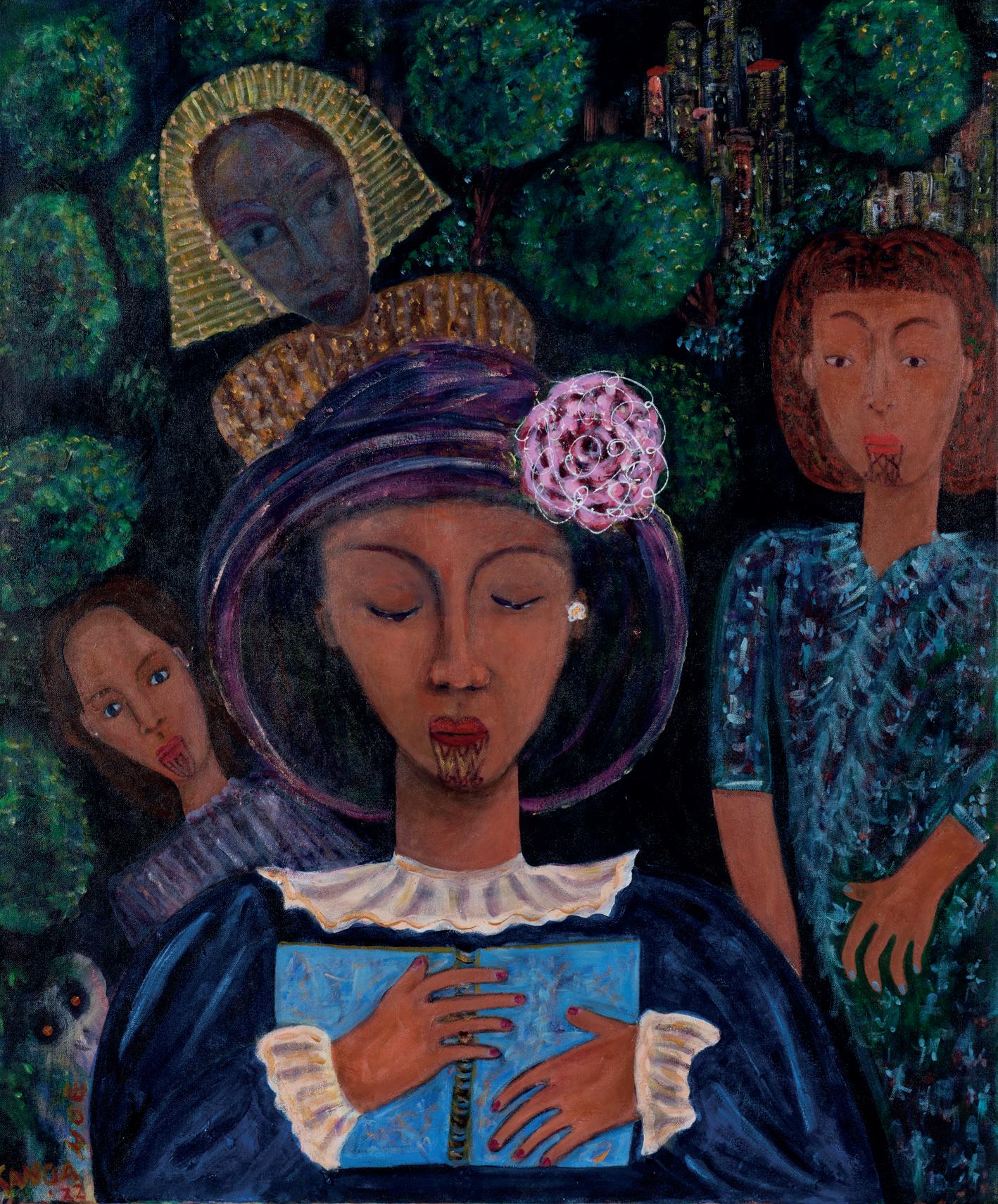 in this regard. It depicts a central figure clutching a book to her chest. Three additional figures surround the primary subject, perhaps they are relatives or ancestors. Hinemoa, a mermaid figure carved in totara, has a similarly stylised figure style to those seen in the artist’s paintings. Together, these works present a compelling view of Ropata-Tangahoe’s practice.