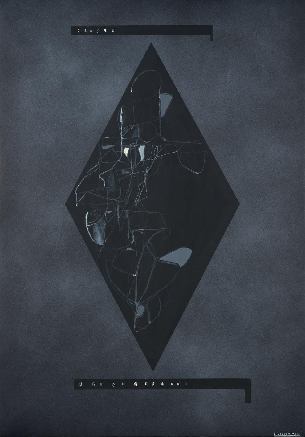 The works included in this catalogue are pared back, elemental paintings. Closed Neighbourhood from 2014 makes use of text, a diamond shape and a sketch-like figure — all of which are recurrent motifs in his work. In Zero from 2008, Cotton positions a single, visually textured form on a stark background, creating a striking contrast in colour in detail.