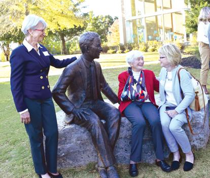 Michael McBrien; former Webb Board of Trustees Chair, John Tolsma; and Webb Board of Trustees Chair, Misty Mayes outside of Webb's Governor's Center for Innovation. (below, l to r) Bill Haslam with Sharon G. Lee in front of a 2014 photo featuring Herbert H. Slatery III ’70 being sworn in as Tennessee Attorney General by then-Governor Haslam and Tennessee Supreme Court Chief Justice Lee.