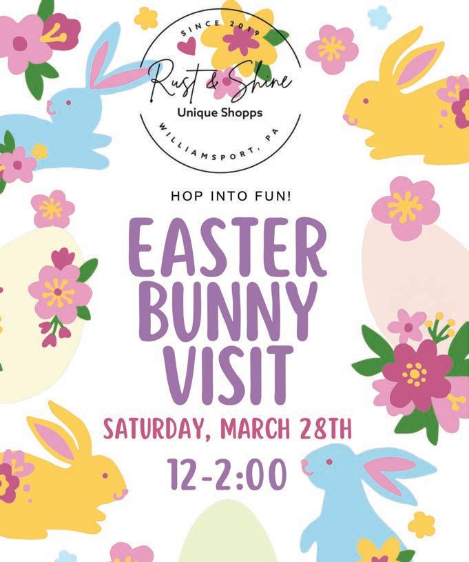 Head over to Rust Shine, 600 Cemetery St., Williamsport, on March 28th, for an Easter Bunny Visit Golden Egg Hunt! oin them from noon-2 p.m. for a fun- lled Easter celebration! Bring the kids down to snap photos with the Easter Bunny and en oy a festive afternoon at the store. The rst 100 kids will receive a free goodie bag, so be sure to come early! But the fun isn t ust for the little ones They re hosting a special Golden Egg Hunt for adults throughout the store all day long! Keep your eyes open you never