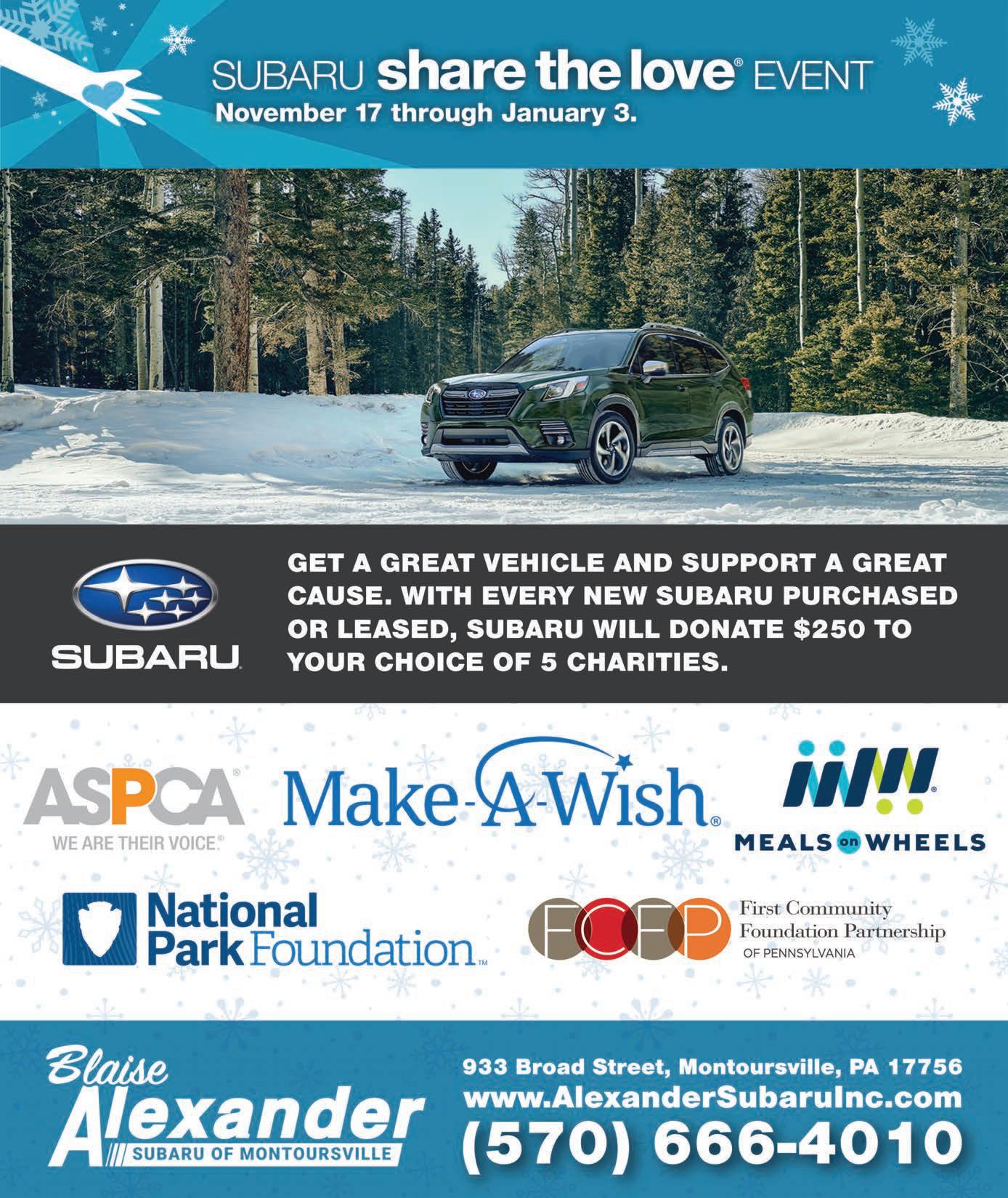 5 • Webb Weekly November 30, 2022 www.webbweekly.com Call 570-326-9322 WITH DISCOUNTS $5,000 PLUS 2.9% FOR 72MOS.* UP TO 10 GLADIATORS STARTING AT $42,900 AFTER DISCOUNTS $399 PER MONTH** OVER 50 RAMS •• • OVER 40 JEEPS •• • • • • NEW JEEP • • • GRAND CHEROKEE L LAREDO 4X4 AVAILABLE • • • AVAILABLE • • • VANCAMPENMOTORS.COM 601 W 3RD ST. WILLIAMSPORT, PA • 570-326-0567 *$53,810 MSRP $5,000 off 48,810 sale price plus 2.9% for 72 or 4.9% for 84. **Lease for well qualified lessees for 39 months and $5299 DAS. Based on MSRP example of $46,590 with 22A package after all applicable offers. Must own a Stellantis Brand vehicle in household. Total due at lease signing includes a down payment and first month’s payment. Offer requires dealer contribution.Tax, title & license extra. Lessee pays for excess wear and mileage of $.25/mile for each mile over 10,000 milesper year, if vehicle isreturned at end of term. Option to buy at lease end at pre-negotiated price. Dealer’s actual terms may vary. Offer through Chrysler Capital. Residency restrictions apply. Must take retail delivery by 11/30/2022. Offers Include all available rebates. Expires November 30, 2022. Tax, tags, license extra. Certain restrictions apply, see dealer for details. Photos for illustration purposes only BLACK FRIDAY SAVINGS ARE ALREADY HERE! THE HIGHEST RATED DEALERSHIP! THE MOST INVENTORY IN THE AREA!