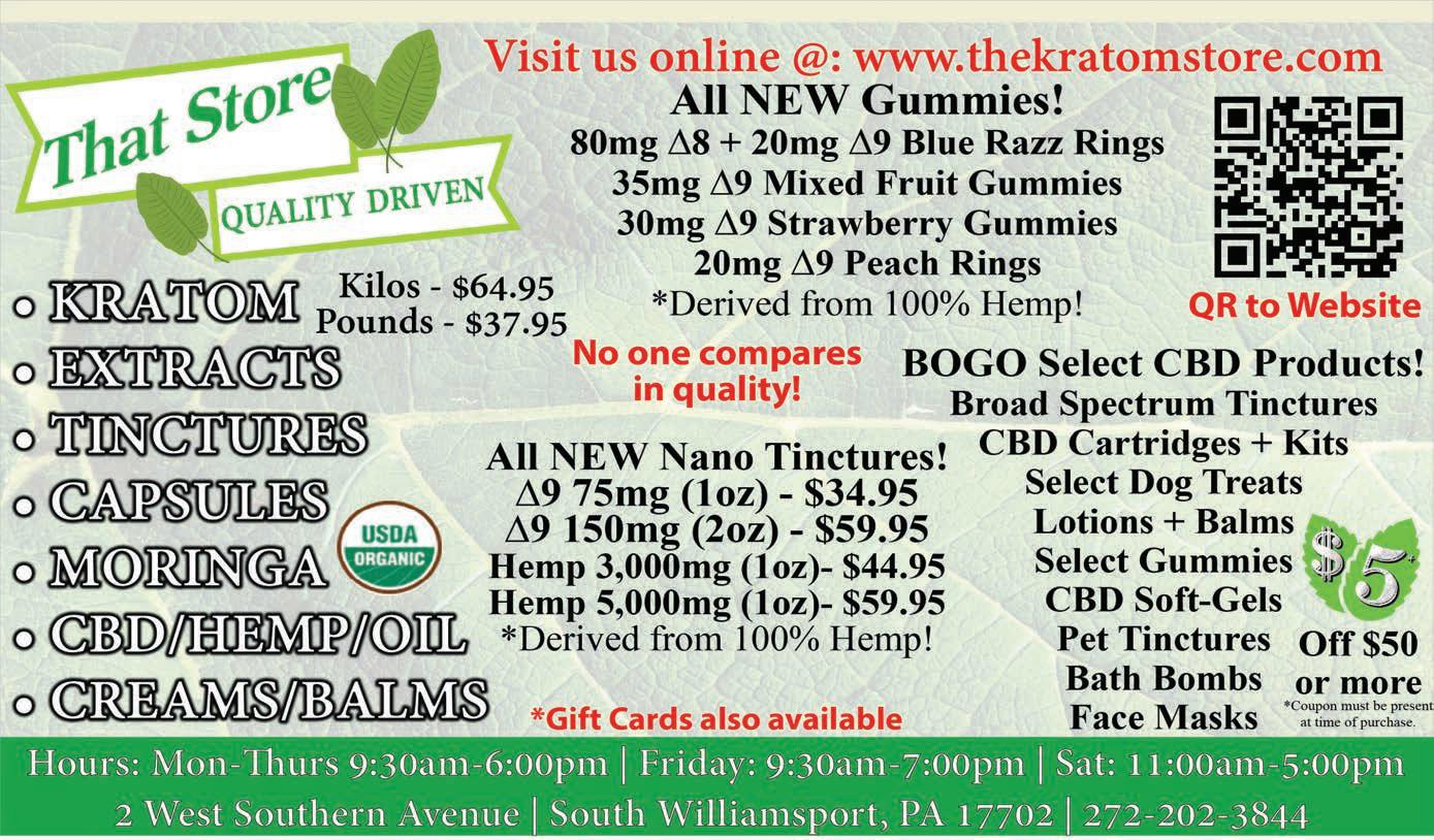 STOP BY OR CALL TO PLACE YOUR ORDER TODAY! 209 East Winter Road • Loganton, PA • 570-725-2247 Poinsettias, Wreaths, Pine Centerpieces & Gift Baskets OPEN NOW THRU 12/31 5 5 $ $ TIE DYE BUCKS TIE DYED LOVE LLC 515 West Southern Ave Suite A • South Williamsport, PA 17702 Redeemable only at Tie Dyed Love llc. Expires 12/31/22 Receive $5 Off any tie dyed item valued at $10 or more. Tuesday–Friday 10-5 Saturday 10-2 Extended Holiday Hours: Beginning Wed. Dec 14th Tues. - Fri 10am -7pm Sat. 10am -3pm Pizzas, Hoagies & Mini-stroMbolis REGULAR • ITALIAN • HAM 16” CHeese Pizza onlY $10 C 1308 S. Rt. 44 • Jersey Shore, PA • 8am-3pm JERSEY SHORE FARM MAR KET EVERY WEEK AT THE froM Mountain M View Sub Shack CALL 570-337-5597 TO ORDER! SWEET MEMORIES. HOLIDAY TRADITIONS. 115 years and counting. Stop in today to create or continue your family tradition. Every child gets a free candy cane! MON.-SAT. 9:30 AM -3:00 PM HOLIDAY HOURS: NOV. 25 th - D EC. 23 rd • CHRISTMAS EVE: 9AM -1PM M ON.-SAT 9 AM -5 PM • SUN 11AM -3 PM Allenwood Factory & Store 18047 US Route 15 • 570-538-9502 & 422 Market St., Lewisburg, PA 17837 570-524-0823 WATCH US MAKE CANDY! Allenwood Location Only See HAPPENINGS on Page 6
